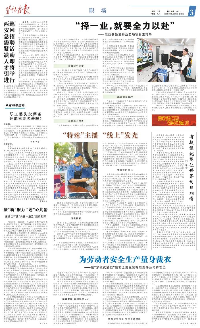 有这样一支队伍,组员平均年龄30岁,每天手拿量尺裁刀,与服装布料打交道,与其他时装厂不同的是,这支队伍主要以设计制作特种行业服装为主。他们就是陕西金翼服装有限责任公司样衣组。 样衣组有18名成员,从事服装的工艺设计、招标样衣、客户标准样衣制作、用料核算等关键程序的工作。自成立以来,在中石油、中石化、中航工业、神华煤业等大型企业防护服换装、换版、更换面料等重要节点上,一次次攻坚克难,为给企业生产设计出符合工作环境要求的服装。今年9月,这支精益求精的队伍被陕西省总工会评为“梦桃式班组”。 精益求精 赢得客户认可 样衣是设计流程中检验实物样品的第一道程序。10月12日,记者走进金翼服装样衣组车间,工人们正有条不紊地裁剪样衣,一派忙碌景象。班组长丑红利说:“工装与时装最大的区别在于,工装更注重实用性,需要考虑的细节有很多,每一处设计都有它存在的意义,不能有丝毫闪失。”一件样衣的制作包括原始设计、面料选定及采购、设计做版、排版打印、面料裁剪、单个样品制作、技术验收等,每一件样衣都需要样衣组的成员们依照工艺图纸不差丝毫地制作出精品服装。 2021年12月中旬,企业突然接到中石油全部重新换款换面料的通知。“企业重新招标,我们就必须竭尽全力,让顾客重新选择我们!”技术总监张保保对小组成员们说。那一刻,大家知道即将迎来一场“硬仗”。 中石油此次换款对工装提出了新的要求,他们希望能重新设计服装样式,重新更换面料,同时增加多种配饰,款式必须更加符合工作环境需要,更好为员工起到防护作用,还要具备穿着更加舒适、美观时尚等特点。面对顾客的新需求,样衣组在最短时间内给出了新方案。 时间紧任务重,小组成员们蓄势待发。设计师贾瑶依据石油工人的工作特点加入一些改进元素,设计出符合客户要求的图样;制版师田鹏根据设计图样,反复琢磨推敲,在电脑上制出样版;裁剪师用一双巧手裁出样板;几位缝制师一次次加班加点反复论证和修改,利用精湛的缝制技术和整烫工艺,将精致的样衣呈现在大家面前。最终在规定的时间内完成任务按时交付,从众多服装厂中脱颖而出,赢得客户的高度赞扬和认可。 提高业务水平 守牢生命防线 “劳动防护服就是用来保护劳动者生命的,每一件防护服关系着每一个劳动者,所以我们任何时候要把防护服的质量放在第一位,决不能掉以轻心。”丑红利说。在他的带领下,小组成员通过培训、轮岗锻炼等形式,开展全方位、多层次业务培训,优化搭档,以优带差,提高每位成员技能水平。 从最初的防静电服、阻燃服、防酸服等只具备单一功能性的工装,到现在的防静电阻燃服、防静电防酸服、抗油拒水易去污防护服、防蚊虫防静电防护服等拥有多种功能的防护服,每款功能性服装的提升,都是小组成员与面料厂家、技术人员、设计人员多次试验、设计、修改而成的。每次只要有新的任务,组员们都能克服各种困难,按时到岗,只为完成当下的任务。 在小组成员们的努力下,公司申请获得外观设计专利3个、实用新型专利25项、软著5个。2021年样衣组制作成品3590套件,比 2020 年多生产400套件。 班组长丑红利说:“成绩只能代表过去,未来我将带领班组成员,继续践行‘梦桃精神’,持续增强班组的凝聚力和战斗力,争做新时代的最美奋斗者和‘梦桃精神’的传承人,在服装生产一线勇立新功。” 实习记者 骆红燕