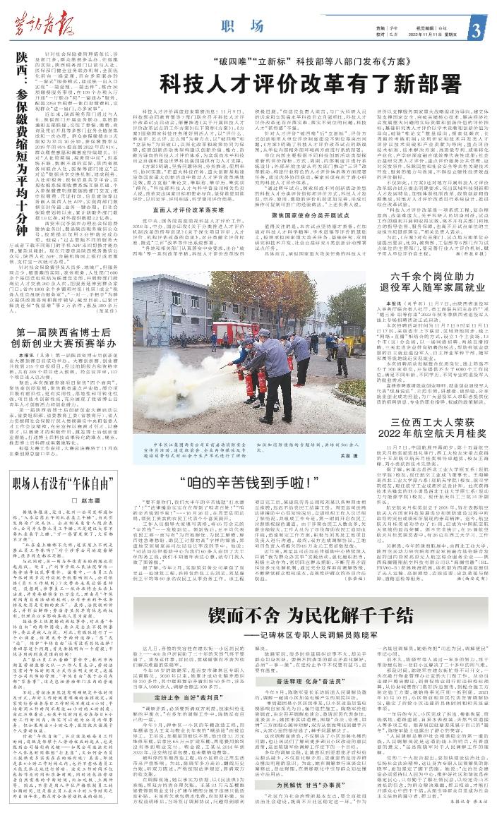 这几日,喜悦的笑容挂在建东街一小区居民的脸上——400余户居民盼了二十年的天然气终于要通了。谈及这件事,居民说,要感谢锲而不舍为他们解决难题的陈晓军。 今年56岁的陈晓军,是西安市碑林区专职人民调解员。2020年以来,她累计成功化解矛盾纠纷230多件,其中疑难复杂矛盾纠纷50多件,涉及当事人5000余人,调解金额达300多万。 定纷止争 当好“裁判员” “调解矛盾,必须要捋清双方利益,找准纠纷化解的平衡点。”在多年的调解工作中,陈晓军有自己的一套。 今年3月,碑林区一小区的车棚改造工程,因车棚承包人王某与物业长年来的“糊涂账”而被迫停工。王某说,车棚屋顶破烂不堪,他出资3.1万元维修车棚,后拿出6.5万元扩建车棚,两笔费用始终没有得到物业支付。物业说,王某从2014年到2022年,没交纳过承包费,也未缴纳电费等。 被叫停的车棚改造工程,给小区群众正常生活带来严重影响。为此,陈晓军多方走访,翻阅历史台账,听双方陈述,严格按照法律规定,算清双方的收支账。 在调解现场,她以事实为依据,以《民法典》为准绳,帮双方捋清合理欠账。王某3.1万元车棚维修费得到物业支付;扩建车棚部分属于违建只做适度补贴。王某所欠承包费水电费,应如期补缴。双方权益明晰后,当场签订调解协议,问题得到顺利解决。 陈晓军说,很多时候基层纠纷事不大,却关乎群众切身利益。要把不同类型的群众矛盾化解好,必须“一事一策”,在定纷止争中不仅要有技巧,更要有温度。 普法释理 化身“普法员” 今年9月,陈晓军受长乐坊街道人民调解员邀约,调解一起因小区加装电梯产生的居民纠纷。 事情起因是小区居民李某,以小区改造加装电梯影响自家采光为由,强行阻拦施工。陈晓军经细致调查,决定召开调解座谈会,邀请居民代表参加。座谈会上,她摆事实讲道理,围绕“合法、论理、讲情”三方面细心疏导劝解,双方从剑拔弩张到握手言和,大家心里的郁结通了,棘手问题解决了。 这次调解座谈会,不仅解决了小区加装电梯的问题,也让居民们了解到更多老旧小区改造的惠民政策,这是陈晓军给调解工作定下的一个目标。 多年的调解实践,让她意识到要想使矛盾纠纷从源头减少,不仅要化解矛盾,更重要的是培养群众懂法明理的意识。为此,她在调解举行座谈会以案释法,普法释理,在潜移默化中引导群众知法懂法守法用法。 为民解忧 甘当“办事员” “社区作为社会治理的基本支点,要全面推进法治社会建设,就离不开社区稳定这一环。”作为一名基层调解员,她始终把“司法为民,调解便民”牢记心间。 前不久,陈晓军等人通过一年多的努力,终于帮助建东街一老旧小区解决了二十多年的用气难。 那段时间,陈晓军在建东街忙得不可开交,一次次敲开物业管理办公室的大门做工作。从动员违建户腾房搬迁,到督促物业进行拆违招投标预算,从协助城管部门做好拆违宣传,到配合施工方制定施工方案,她始终事无巨细一抓到底。2021年10月10日,小区物业和居民代表签署调解协议,确定了拆除小区违建的具体时间和相关注意事项。 一年后的今天,小区完成了拆违、楼体恢复、管线落地、道路重铺、自来水表改装、天然气管道接入等多项工程。眼看居民就要迎来属于自己的“暖冬”,陈晓军脸上也露出了舒心的笑容。 “人民调解是维护社会和谐稳定的第一道防线,人民调解员就是这道防线上的哨兵,有着重要的意义。”这是陈晓军对于人民调解工作的理解。 党的二十大报告提出,要加快建设法治社会,弘扬社会法治精神,这让身为专职人民调解员的陈晓军,更加坚定了脚下的路。她说:“法治社会建设必须坚持以人民为中心,维护好社区和谐就是在稳定民心,只有勤于了解社情民意,以咬定青山不放松的信念,为群众解决难题,捍卫权益,才能打开群众心中的千千结,从而引导群众自觉成为社会主义法治的遵守者、捍卫者。” 本报记者 唐玉洁
