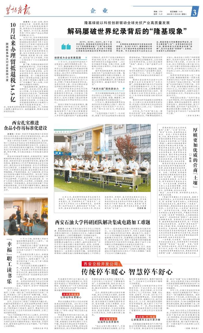 26.74%、26.78%、26.81%,在1个多月时间内,隆基绿能科技股份有限公司(以下简称隆基绿能)“三刷”硅太阳能电池转换效率新纪录,成为首个打破硅太阳能电池转换效率世界纪录的中国企业。 太阳能电池转换效率与度电成本紧密相关。自2021年至今,隆基绿能已经连续11次打破多种电池转换效率的世界纪录。作为全球光伏行业的龙头企业,隆基绿能为何能屡破世界纪录,牢牢占据发展“C位”?在竞争激烈的光伏市场,隆基绿能为何能摸准发展“脉搏”,成为行业里的“常青树”?这背后,究竟有什么样的秘密? 创新成为企业发展基因 11月19日,注定成为中国光伏产业发展史上具有里程碑意义的一天。 当日,隆基绿能对外发布消息:世界公认的权威测试机构德国哈梅林太阳能研究所(ISFH)最新认证报告显示,该公司自主研发的硅异质结电池转换效率达26.81%。 这是继 2017年日本公司创造单结晶硅电池转换效率纪录 26.7%以来,时隔5年诞生的最新世界纪录,也是光伏史上第一次由中国企业创造的硅电池转换效率世界纪录。 中国科学技术协会党组书记张玉卓表示,此次打破硅太阳能电池转换效率世界纪录,不仅彰显了我国光伏企业硅太阳能电池制造的科技实力,还有力提振了我国在更多科技领域走向世界前列的信心和决心。 坚持以创新为企业发展理念,隆基绿能自 2000 年成立以来,始终以高效率、低成本、高可靠性的太阳能电池及组件产品引领全球能源变革。目前,隆基绿能在全行业率先导入并培养完整的国内产业链金刚线切割技术,率先在产品端大规模应用单晶PERC 技术,生产的单晶PERC组件连续多年出货量全球第一,2021年单晶组件销量、市场占有率、品牌影响力均居全球首位,市场头部地位进一步夯实。 提升电池转换效率、降低度电成本是光伏产业发展的永恒主题。隆基绿能科技股份有限公司创始人、总裁李振国表示,通过实践,创新早已融入企业发展的基因中,成为隆基绿能持续领先、超越自我的“制胜法宝”。 “光伏大脑”提供源动力 在泾河新城隆基绿能光伏产业园的自动化无尘车间里,一片片银色单晶硅片经过制绒、刻蚀、镀膜等工序后,变成深蓝色的太阳能电池片。 9月28日,隆基绿能高效单晶电池项目在泾河新城正式投产,预计明年全部达产后可实现年产15吉瓦,全年产值可达300 亿元,带动就业8000人。 “从签约到投产仅用了一年半时间,创造了我们企业电池项目建设速度最快纪录。”隆基绿能科技股份有限公司品牌总经理霍焱说,正是当地良好的营商环境,让他们决定继续“加码”,推动上下游产业链齐头并进。 如今,在陕西,以隆基绿能、美畅等为代表的光伏产业发展势头强劲,年产值近千亿元。今年7月,隆基中央研究院在西咸新区泾河新城正式投用。 落成在秦创原光伏创新中心的隆基中央研究院被称为“光伏大脑”,是隆基绿能开展光伏产业研发工作的重要载体平台,汇聚了企业最顶尖的研发力量,是承载着隆基绿能未来愿景实现的核心组织。预计隆基中央研究院全面投入运行后,5年内每年将取得1000项科研成果。 隆基中央研究院副院长徐希翔表示,公司成立以来高度重视创新发展,研发投入连续多年位居全球光伏企业研发投入之首,占比一直稳定在5%至7%左右。 近年来,为了实现“放大每一缕阳光的价值”目标,隆基绿能坚持锚定产业发展前沿,不断增加经费和人才投入,推动企业主导的产学研深度融合,为光伏行业技术进步、降本增效作出了重大贡献。自2012年上市以来,该公司研发投入累计超100亿元,2021年累计获得各类已授权专利1387项,全年研发投入43.94亿元,占营业收入5.43%,较2020年同比增长69.55%。 凭借持续的研发投入和“开放式”创新,隆基绿能的每一项重大技术都成为光伏产业的“风向标”,持续为全球客户创造长期价值。“阳光财富”在创新的催化下不断升值。今年前三季度,隆基绿能实现营业收入870.35亿元,同比增长54.85%;主营产品出货量持续增长,实现单晶硅片出货量超60吉瓦,单晶组件出货量超30吉瓦。 李振国坚定地说:“光伏行业应不受外界影响,回归电池效率提升的主赛道,加强对电池新材料、新技术的研发投入,做好科技创新,致力于降本增效,提升光伏产业的竞争力,推动清洁能源大规模应用。这才是当前及未来中国光伏产业发展的重中之重。” (苏怡 宋美娜)