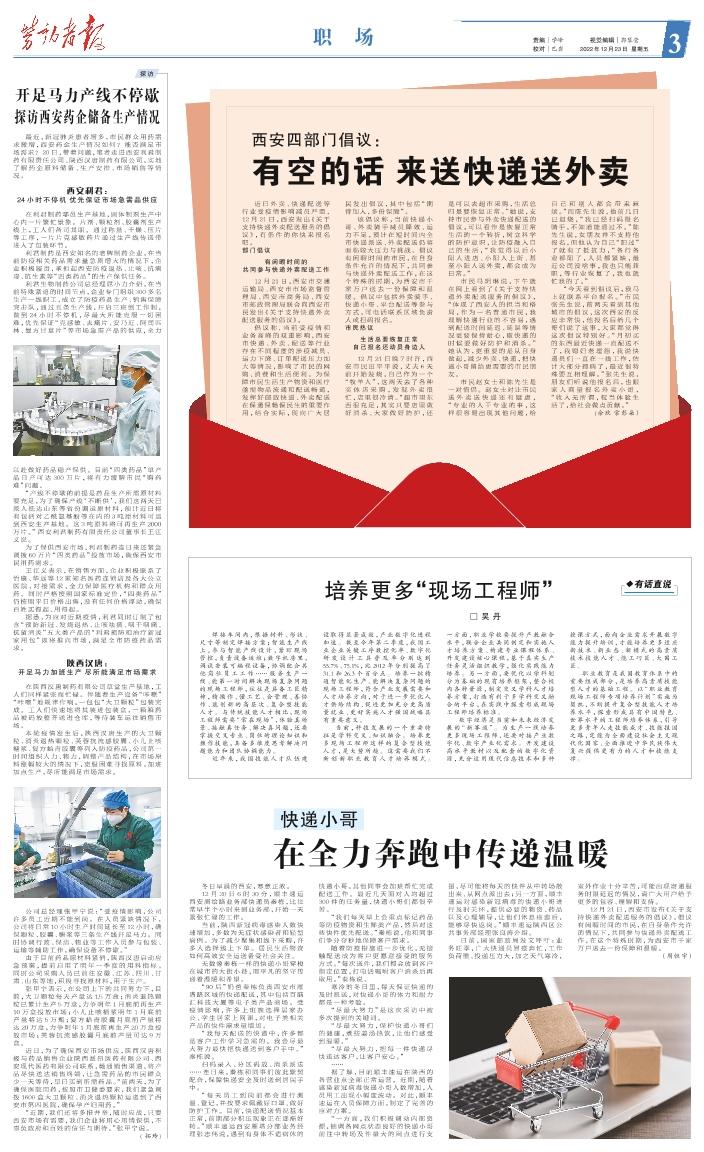 近日外卖、快递配送等行业受疫情影响减员严重,12月21日,西安发出《关于支持快递外卖配送服务的倡议》,有条件的你快来报名吧。 部门倡议 有闲暇时间的共同参与快递外卖配送工作 12月21日,西安市交通运输局、西安市市场监督管理局、西安市商务局、西安市邮政管理局联合向西安市民发出《关于支持快递外卖配送服务的倡议》。 倡议称,当前受疫情和业务高峰的双重影响,西安市快递、外卖、配送等行业存在不同程度的涉疫减员、运力下降、订单配送压力加大等情况,影响了市民的网购、消费和生活便利。为保障市民生活生产物资和医疗亟需物品流通和配送畅通,发挥好邮政快递、外卖配送在保通保畅保民生的重要作用,结合实际,现向广大居民发出倡议,其中包括“期待加入,多份保障”。 该倡议称,当前快递小哥、外卖骑手减员降效、运力不足,预计在短时间内全市快递派送、外卖配送仍将面临较大压力与挑战。倡议有闲暇时间的市民,在自身条件允许的情况下,共同参与快递外卖配送工作,在这个特殊的时期,为西安市千家万户送去一份保障和温暖。倡议中包括外卖骑手、快递小哥、平台配送等参与方式,可电话联系区域负责人或扫码报名。 市民热议 生活总要恢复正常 自己报名还动员身边人 12月21日晚7时许,西安市民田平平说,丈夫6天前开始发烧,自己作为一个“牧羊人”,这两天去了各种实体店采购,发现外卖很忙,店里很冷清。“超市里东西很充足,其实只要店里做好消杀、大家做好防护,还是可以去超市采购,生活总归是要恢复正常。”她说,支持市民参与外卖快递配送的倡议,可以看作是恢复正常生活的一个转折,树立科学的防护意识,让防疫融入自己的生活,“我觉得以后小阳人进店、小阳人上街、甚至小阳人送外卖,都会成为日常。” 市民马玥琳说,下午就在网上看到了《关于支持快递外卖配送服务的倡议》,“体现了西安人的担当和格局,作为一名普通市民,我理解快递行业的不容易,遇到配送时间延迟、延误等情况更要保持耐心,取快递的时候要做好防护和消杀。”她认为,更重要的是从自身做起,减少外卖、快递,把快递小哥留给更需要的市民朋友。 市民赵女士和陈先生是一对情侣。赵女士对让市民送外卖送快递还有疑虑,“专业的人干专业的事,这样很容易出现其他问题,给自己 和 别人 都 会带 来 麻烦。”而陈先生说,他前几日已退烧,“我已经扫码报名骑手,不知道能通过不。”陈先生说,女朋友并不支持他报名,但他认为自己“阳过”了就有了抵抗力,“各行各业都阳了,人员都紧缺,最近公司没啥事,我也只能兼职,等行业恢复了,我也就忙我的了。” “今天看到倡议后,我马上就联系平台报名。”市民张先生说,前两天看到其他城市的倡议,这次西安的反应非常快,他报名后给几个哥们说了这事,大家都觉得这次倡议特别好。“月初买的东西最近快递一直配送不了,我媳妇老埋怨,我说快递员们一直在一线工作,估计大部分都病了,最近很特殊要互相理解。”张先生说,朋友们听说他报名后,也跟家人商量报名外卖小哥,“收入无所谓,权当体验生活了,给社会做点贡献。” (佘欣 常彭朵)