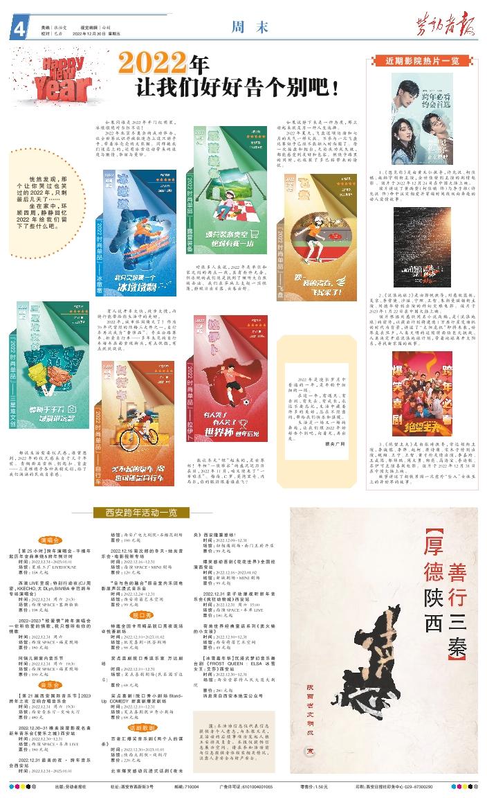 演唱会 【第25小时】跨年演唱会-千禧年起历年金曲串烧&跨年倒计时 时间:2022.12.31-2023.01.01 场馆:星球工厂LIVEHOUSE 票价:158元起 西演LIVE呈现:特别行动夜(CJ周密,KKECHO,大DLyn,SIIVIBA辛巴跨年专场演唱会) 时间:2022.12.31 周六 20:30 场馆:西演SPACE·塞斯拾陆 票价:198元起 2022-2023“致爱情”跨年演唱会—你听你爱的情歌,我只想听有你的情歌 时间:2022.12.31 周六 场馆:西演SPACE·福星现场 票价:180元起 同锅儿涮室内音乐节时间:2022.12.31 周六 19:30场馆:西演SPACE·福星现场票价:100元起 音乐会 【第21届西安国际音乐节】2023跨年之夜 交响合唱音乐会 时间:2022.12.31 周六 19:30 场馆:西安音乐厅-交响大厅 票价:480元 2022.12.30-31唯美浪漫影视名曲新年音乐会《爱乐之城》西安站 时间:2022.12.30-12.31 场馆:西演SPACE·车库LIVE 票价:180元起 2022.12.31最美的夜 · 跨年音乐会西安站时间:2022.12.31-2023.01.01场馆:西安广电大剧院·石榴花剧场票价:180元起 2022.12.16菊次郎的冬天·烛光音乐会·电影视听专场 时间:2022.12.16-12.31 场馆:西演SPACE·MINI剧场 票价:120元起 “音与色的融合”原音室内乐团电影原声沉浸式音乐会 时间:2022.12.24-12.31 场馆:西安荷苗艺术空间 票价:99元起 脱口秀 特邀全国卡司精品脱口秀夜现场@悦荟剧场 时间:2022.12.10-2023.01.02 场馆:玩笑喜剧·悦荟剧场 票价:88元起 笑点喜剧脱口秀逗乐室 万达剧场 时间:2022.12.10-12.31场馆:笑点喜剧剧场(民乐园万达店) 票价:68元起 笑点喜剧|脱口秀小剧场Stand-Up COMEDY 新喜剧爆笑剧场 时间:2022.12.10-12.31 场馆:笑点喜剧脱口秀小剧场 票价:68元起 话剧歌剧 百老汇爆笑音乐剧《两个人的谋杀》 时间:2022.12.30-2023.01.01场馆:陕西大剧院-戏剧厅票价:220元起 北京爆笑感动沉浸式话剧《夜未央》西安隆重登场! 时间:2022.12.09-12.31 场馆:初相遇剧场·南门王府井店 票价:99元起 爆笑感动喜剧《花花世界》全国巡演西安站 时间:2022.12.16-2023.01.02 场馆:新城剧场·MINI剧场 票价:99元起 2022.12.31亲子动漫视听新年音乐会《疯狂动物城》西安站 时间:2022.12.31 周六 15:00 场馆:西演SPACE·车库LIVE 票价:180元起 荷苗世界经典童话系列《卖火柴的小女孩》 时间:2022.12.10-12.31 场馆:西安荷苗艺术空间 票价:49元起 【冰雪嘉年华】沉浸式梦幻音乐舞台剧《FROST QUEEN : ELSA 冰雪女王:艾莎》西安站 时间:2022.12.30-12.31 场馆:西安索菲特人民大厦大剧院 票价:280元起 消息来自西安本地宝公众号 注:本活动信息仅代表信息提供者个人意志,与本报无关,且活动的后续事项由发起人独立安排及负责。本报仅提供信息展示空间。请在参加活动前与信息提供者体核实相关情况,注意人身安全与财产安全。