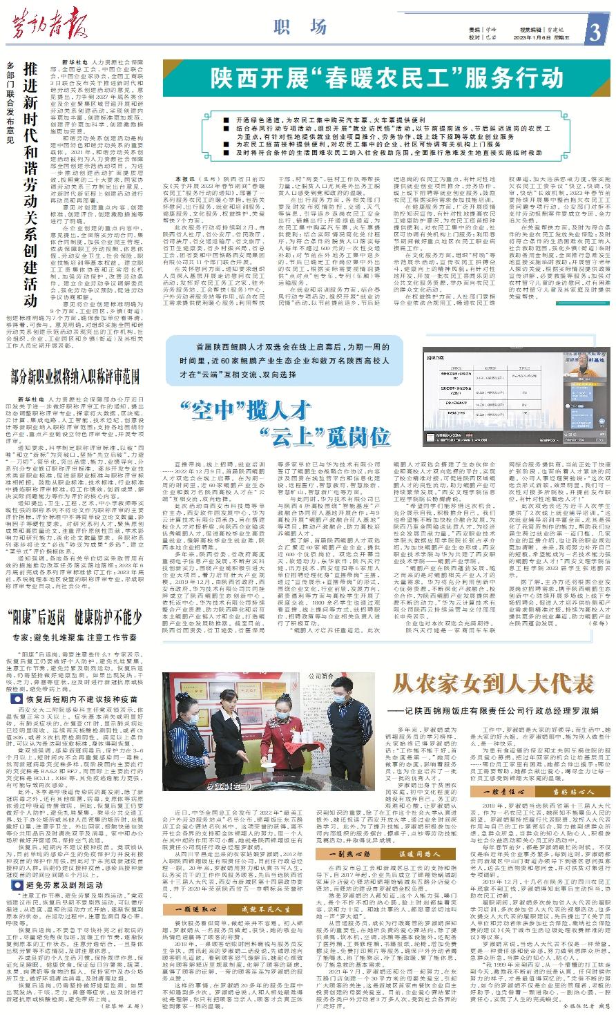 ■ 开通绿色通道,为农民工集中购买汽车票、火车票提供便利■ 结合春风行动专项活动,组织开展“就业访民情”活动,以节前提前返乡、节后延迟返岗的农民工 为重点,有针对性地提供就业创业项目推介、劳务协作、线上线下招聘等就业创业服务■ 为农民工疫苗接种提供便利,对农民工集中的企业、社区可协调有关机构上门服务■ 及时将符合条件的生活困难农民工纳入社会救助范围,全面推行急难发生地直接实施临时救助 本报讯 (孟珂) 陕西省日前印发《关于开展2023年春节期间“春暖农民工”服务行动的通知》,部署了一系列服务农民工的暖心举措,包括关怀慰问、出行服务、就业和培训服务、健康服务、文化服务、权益维护、关爱帮扶7个方面。 此次服务行动将持续到2月,由陕西省人社厅、省公安厅、省民政厅、省司法厅、省交通运输厅、省文旅厅、省卫生健康委、省乡村振兴局、省总工会、团省委和中国铁路西安局集团有限公司共11个部门联合开展。 在关怀慰问方面,通知要求组织人员深入基层开展走访慰问农民工活动;发挥好农民工务工之家、驻外劳务服务站、工会帮扶(服务)中心、户外劳动者服务站等作用,结合农民工需求提供便利暖心服务;利用帮扶干部、村“两委”、驻村工作队等帮扶力量,让脱贫人口尤其是外出务工脱贫人口感受到党和政府的温暖。 在出行服务方面,各相关部门要及时发布疫情防控、交通、天气等信息,引导返乡返岗农民工安全出行、错峰出行;开通绿色通道,为农民工集中购买汽车票、火车票提供便利;结合实际情况简化兑付程序,为符合条件的脱贫人口落实每人每年不超过500元的一次性交通补助;对节前在外地务工集中返乡的、节后已确定工作岗位集中外出的农民工,根据实际需要视情况提供“点对点”包专车、专列(车厢)等运输服务。 在就业和培训服务方面,结合春风行动专项活动,组织开展“就业访民情”活动,以节前提前返乡、节后延迟返岗的农民工为重点,有针对性地提供就业创业项目推介、劳务协作、线上线下招聘等就业创业服务;鼓励农民工根据实际需求参加技能培训。 在健康服务方面,广泛开展疫情防控知识宣传,有针对性地提高农民工健康防护意识,为农民工疫苗接种提供便利,对农民工集中的企业、社区可协调有关机构上门服务;利用春节期间做好重点地区农民工职业病摸底工作。 在文化服务方面,组织“村晚”等示范展示活动,宣传农民工拼搏奋斗、健康向上的精神风貌;有针对性地开发、开放一批农民工喜闻乐见的公共文化服务资源,举办面向农民工的群众文化活动。 在权益维护方面,人社部门要指导企业依法合规用工,畅通农民工维权渠道,加大违法惩戒力度,落实拖欠农民工工资争议“快立、快调、快审、快结”长效机制,2023年春节前要持续开展集中整治拖欠农民工工资问题专项行动。公安部门对拒不支付劳动报酬案件要成立专班,全力追欠免损。 在关爱帮扶方面,及时为符合条件的失业农民工发放失业保险;及时将符合条件的生活困难农民工纳入社会救助范围,强化乡镇(街道)临时救助备用金制度,全面推行急难发生地直接实施临时救助;开展留守老年人探访关爱,根据实际情况提供政策宣传讲解、必要救援等服务;加强对农村留守儿童的走访慰问,对有困难的农村留守儿童及其家庭及时提供关爱帮扶。