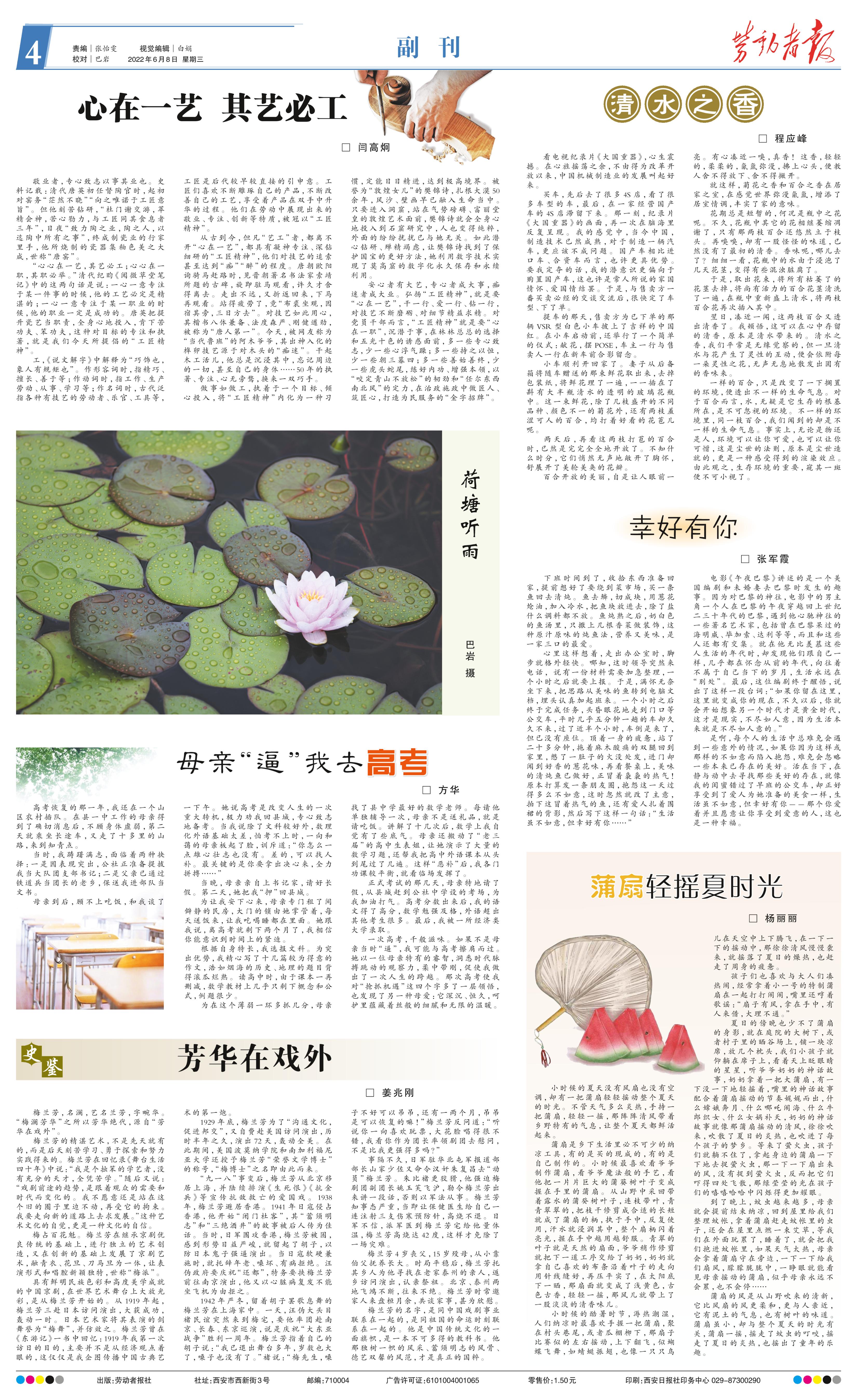 小时候的夏天没有风扇也没有空调,却有一把蒲扇轻轻摇动整个夏天的时光。不管天气多么炎热,手持一把蒲扇,轻轻一摇,那阵阵清风带着乡野特有的气息,让整个夏天都鲜活起来。 蒲扇是乡下生活里必不可少的纳凉工具,有的是买的现成的,有的是自己制作的。小时候最喜欢看爷爷制作蒲扇,看爷爷魔法般的手艺,看他把一片片巨大的蒲葵树叶子变成握在手里的蒲扇。从山野中采回带着露水的蒲癸树叶子,连枝带叶,青青翠翠的,把枝干修剪成合适的长短就成了蒲扇的柄,执于手中,反复使用,汗水就浸润其中,整个扇柄闪着亮光,握在手中越用越舒服。青翠的叶子就是天然的扇面,爷爷稍作修剪就把下一道工序交给了奶奶,奶奶就拿自己喜欢的布条沿着叶子的走向用针线缝好,再压平实了,在太阳底下一晒,那扇面就变成了浅黄色,古色古香,轻轻一摇,那风儿就带上了一股淡淡的清香味儿。 小时候的酷暑时节,溽热潮湿,人们纳凉时最喜欢手握一把蒲扇,聚在村头巷尾,或者瓜棚柳下,那扇子比赛似的左右摇动,上下翻飞,似蝴蝶飞舞,如蜻蜓振翅,也像一只只鸟儿在天空中上下腾飞,在一下一下的摇动中,那徐徐清风慢慢袭来,就摇落了夏日的燥热,也赶走了周身的疲惫。 孩子们也喜欢与大人们凑热闹,经常拿着小一号的特制蒲扇在一起打打闹闹,嘴里还哼着歌谣:“扇子有风,拿在手中,有人来借,大理不通。” 夏日的傍晚也少不了蒲扇的身影,就在庭院的大树下,或者村子里的晒谷场上,铺一块凉席,放几个枕头,我们小孩子就仰躺在席子上,看着天上眨眼睛的星星,听爷爷奶奶的神话故事,奶奶拿着一把大蒲扇,有一下没一下地轻摇着,嘴里的神话故事配合着蒲扇摇动的节奏娓娓而出,什么嫦娥奔月、什么哪吒闹海、什么牛郎织女、什么女娲补天,奶奶的神话故事就像那蒲扇摇动的清风,徐徐吹来,吹散了夏日的炎热,也吹进了每个孩子的梦乡。等来了萤火虫,孩子们就躺不住了,拿起身边的蒲扇一下下地去捉萤火虫,那一下一下扇出来的风,没有捉到萤火虫,反而把它们吓得四处飞散,那绿莹莹的光在孩子们的嘻嘻哈哈中闪烁得更加耀眼。 到了晚上,蚊虫越来越多,母亲就会提前结束纳凉,回到屋里给我们整理蚊帐,拿着蒲扇赶走蚊帐里的虫子,还会在屋里点燃一束艾草,等我们在外面玩累了,睡着了,就会把我们抱进蚊帐里,如果天气太热,母亲会拿着蒲扇守在旁边,一下一下给我们扇风,朦朦胧胧中,一睁眼就能看见母亲摇动的蒲扇,似乎母亲永远不会累,也不会停…… 蒲扇的风是从山野吹来的清新,它比风扇的风更柔和,更与人亲近,它有泥土的气息,也有树叶的味道。蒲扇虽小,却与整个夏天的时光有关,蒲扇一摇,摇走了蚊虫的叮咬,摇走了夏日的炎热,也摇出了童年的乐趣。
