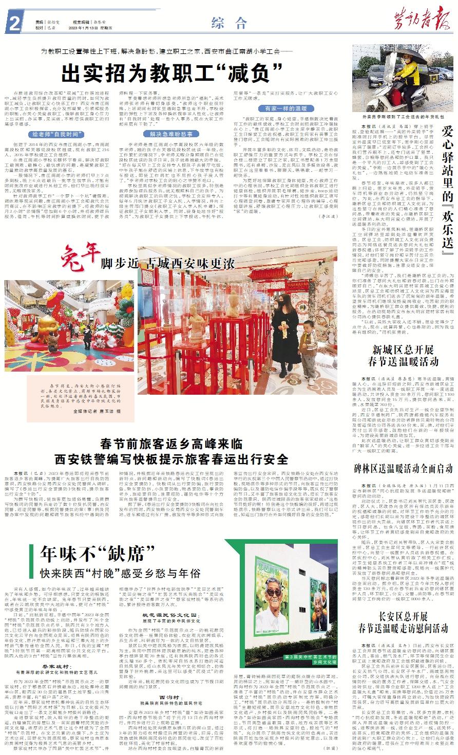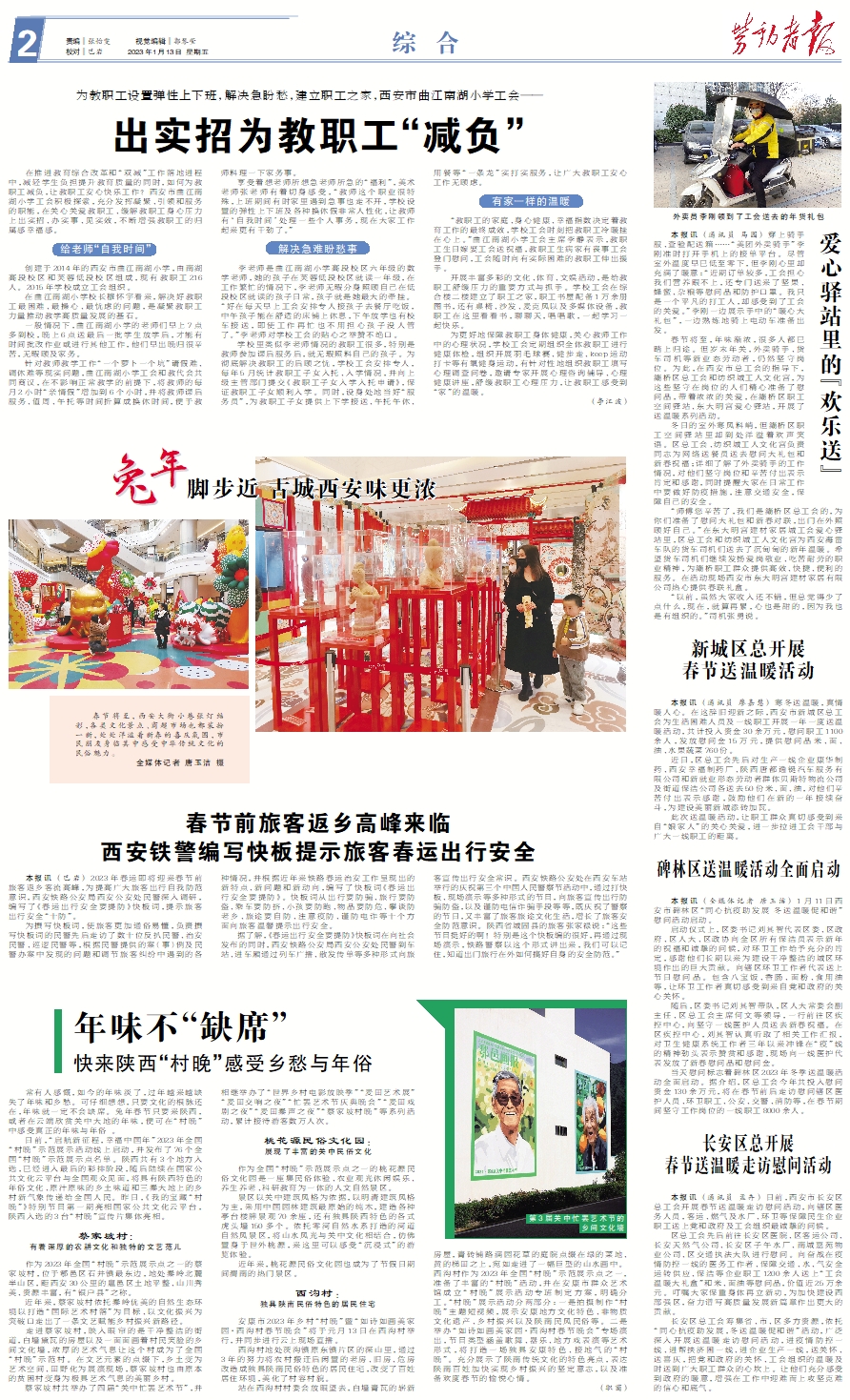 本报讯 (通讯员 马园) 穿上骑手服、查验配送箱……“美团外卖骑手”李刚准时打开手机上的接单平台。尽管室外温度早已低至零下,但李刚心里却充满了暖意:“近期订单较多,工会担心我们营养跟不上,还专门送来了坚果、蜂蜜、杂粮等慰问品和防护口罩。我只是一个平凡的打工人,却感受到了工会的关爱。”李刚一边展示手中的“暖心大礼包”,一边熟练地骑上电动车准备出发。 春节将至,年味渐浓,很多人都已踏上归途。但岁末年关,外卖骑手、货车司机等新业态劳动者,仍然坚守岗位。为此,在西安市总工会的指导下,灞桥区总工会和纺织城工人文化宫,为这些坚守在岗位的人们精心准备了慰问品,带着浓浓的关爱,在灞桥区职工空间驿站、东大明宫爱心驿站,开展了送温暖系列活动。 冬日的室外寒风料峭,但灞桥区职工空间驿站里却到处洋溢着欢声笑语。区总工会、纺织城工人文化宫负责同志为网络送餐员送去慰问大礼包和新春祝福;详细了解了外卖骑手的工作情况,对他们坚守岗位和辛苦付出表示肯定和感谢,同时提醒大家在日常工作中要做好防疫措施,注意交通安全,保障自己的安全。 “师傅您辛苦了,我们是灞桥区总工会的,为你们准备了慰问大礼包和新春对联,出门在外照顾好自己。”在东大明宫建材家居城工会爱心驿站里,区总工会和纺织城工人文化宫为西安海雷车队的货车司机们送去了沉甸甸的新年温暖。希望货车司机们继续发扬爱岗敬业、吃苦耐劳的职业精神,为灞桥职工群众提供高效、快捷、便利的服务。在活动现场西安市东大明宫建材家居有限公司热心提供春联礼盒。 “以前,虽然大家收入还不错,但总觉得少了点什么,现在,就算再累,心也是甜的,因为我也是有组织的。”司机张勇说。外卖员李刚领到了工会送去的年货礼包