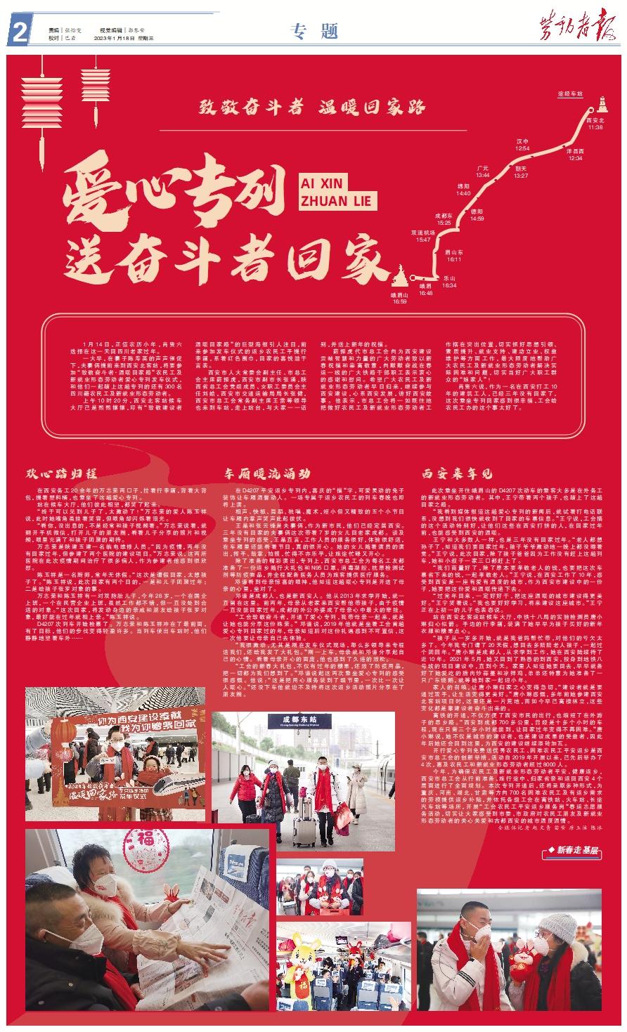 1月14日,正值农历小年,肖贤六选择在这一天回四川老家过年。 一大早,在妻子陈寿英的声声催促下,夫妻俩提前来到西安北客站,将要参加“致敬奋斗者·温暖回家路”农民工及新就业形态劳动者爱心专列发车仪式,和他们一起踏上这趟专列的还有300名四川籍农民工及新就业形态劳动者。 上午10时20分,西安北客站候车大厅已是熙熙攘攘,印有“致敬建设者 温暖回家路”的巨型海报引人注目,前来参加发车仪式的返乡农民工手提行李箱,系着红色围巾,回家的喜悦溢于言表。 西安市人大常委会副主任、市总工会主席薛振虎,西安市副市长张涌,陕西省总工会党组成员、女职工委员会主任刘皓,西安市交通运输局局长张健,西安市总工会常务副主席王雷等领导也来到车站,走上站台,与大家一一话别,并送上新年的祝福。 薛振虎代市总工会向为西安建设贡献智慧和力量的广大劳动者致以新春祝福和崇高敬意,向默默奋战在春运一线的广大铁路干部职工表示衷心的感谢和慰问。希望广大农民工及新就业形态劳动者早日归来,继续参与西安建设,心系西安发展,讲好西安故事。他表示,市总工会将一如既往地把做好农民工及新就业形态劳动者工作摆在突出位置,切实抓好思想引领、素质提升、就业支持、建功立业、权益维护等方面工作,最大限度地帮助广大农民工及新就业形态劳动者解决实际困难和问题,切实当好广大职工群众的“娘家人”! 肖贤六说,作为一名在西安打工10年的建筑工人,已经三年没有回家了,这次乘坐专列回家感到很幸福,工会给农民工办的这个事太好了。欢心踏归程 在西安务工20余年的万志荣两口子,拉着行李箱,背着大背包,提着塑料桶,也乘坐了这趟爱心专列。 站在候车大厅,他们彼此相望,都笑了起来。 “终于可以见到儿子了,太激动了!”万志荣的爱人陈玉祥说,此时她嘴角虽挂着笑容,但眼角却闪烁着泪光。 “看你,没出息的,不是经常和孩子视频着。”万志荣说着,就翻开手机微信,打开儿子的朋友圈,看着儿子分享的照片和视频,眼里充满了和孩子团聚的期待。 万志荣是陕建五建一名临电维修人员。“因为疫情,两年没有回家过年,但参建了两个医院的建设项目。”万志荣说,这两所医院在此次疫情期间治疗了很多病人,作为参建者他感到很欣慰。 陈玉祥是一名厨师,常年无休假。“这次是请假回家,太想孩子了。”陈玉祥说,此次回家有两个目的,一是和儿子团聚过年;二是给孩子张罗对象的事。 万志荣和陈玉祥有一对双胞胎儿子,今年28岁,一个在国企上班,一个在民营企业上班,虽然工作都不错,但一直没处到合适的对象。“这次回家,将发动身边的亲戚和朋友给孩子张罗对象,最好能在过年就相上亲。”陈玉祥说。 D4207次列车开始检票了。万志荣和陈玉祥冲在了最前面,有了目标,他们的步伐变得轻盈许多。当列车使出车站时,他们静静地望着车外……车厢暖流涌动 在D4207平安返乡专列内,喜庆的“福”字,可爱灵动的兔子装饰让车厢温馨动人。一场专属于返乡农民工的列车春晚也即将上演。 相声、快板、舞蹈、独唱、魔术,短小但又精致的五个小节目让车厢内掌声笑声此起彼伏。 王晶和张云锋是夫妻俩,作为新市民,他们已经定居西安。三年没有回家的夫妻俩这次带着7岁的女儿回老家成都。谈及乘坐专列的感受,王晶直言,工作人员的服务很好,体验很舒适,在车厢里还能看着节目,真的很开心。她的女儿随着演员的演出,挥手、鼓掌、拍照,忙得不亦乐乎,让旅途忙碌又开心。 除了准备的精彩演出,专列上,西安市总工会为每名工友都准备了一份返乡随行大礼包和N95口罩、消毒凝胶、抗原检测试剂等防疫物品,并全程配备医务人员为旅客提供医疗服务。 邓谦看到母亲惊喜的眼神,他知道这趟暖心专列是开进了母亲的心里,坐对了。 邓谦是成都人,也是新西安人。他从2013年求学开始,就一直留在这里。前两年,母亲从老家来西安帮他带孩子,由于疫情一直没能回家过年,成都的外公外婆成了母亲心中最大的牵挂。 “工会致敬奋斗者,开通了爱心专列,我带母亲一起来,就是让她也能分享这份殊荣。” 邓谦说,2019年他就是坐着工会首趟爱心专列回家过的年,母亲知道后对这份礼遇感到不可置信,这一次他要让母亲自己去体验。 “我很激动,尤其是刚在发车仪式现场,那么多领导来专程送我们,还给我发了大礼包。”刚一上车,母亲就和邓谦分享起自己的心情。看着母亲开心的面庞,他也感到了久违的放松。 “工会的新春大礼包,不仅有过年的糖果,还放了防疫用品,把一切都为我们想到了。”邓谦说起这两次乘坐爱心专列的感受很感慨。他说:“这是把用心服务装到了细节里,一次比一次让人暖心。”还没下车他就迫不及待将这次返乡活动照片分享在了朋友圈。西安来年见 此次乘坐开往峨眉山的D4207次动车的乘客大多是在外务工的新就业形态劳动者。其中,王宁带着两个孩子,也踏上了这趟回家之路。 “我看到媒体报道这趟爱心专列的新闻后,就试着打电话联系,没想到我们很快就收到了回家的车票信息。”王宁说,工会搞的这个活动特别好,让他们这些在西安打拼的人,在回家过年前,也能感受到西安的温暖。 王宁和大多数人一样,也是三年没有回家过年。“老人都想孙子了,知道我们要回家过年,孩子爷爷激动地一晚上都没睡着觉。”王宁说,此次回家,除了