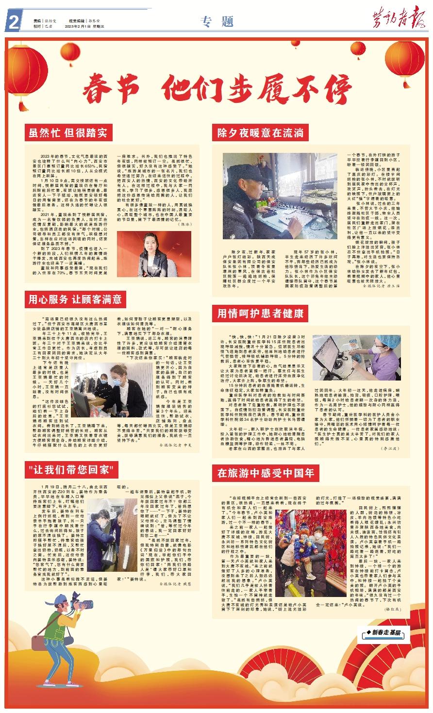 虽然忙 但很踏实 2023年的春节,文化气息最浓的西安也诠释了什么叫“向心力”,西安市景区门票预订量同比增长653%,民宿预订量同比增长超10倍,人从众模式在网上刷屏。 1月10日9点,离交接班还有一点时间,悦新居民宿的董琰仍在餐厅和后厨前后忙着,夜班让她稍显疲惫,最近客人一下子猛增,她既要安顿好每日的用餐需要,还在为春节的年夜饭做最后准备。这样久违的忙碌让人很踏实。 2021年,董琰来到了悦新居民宿,成为一名餐饮部的负责人,当时正在疫情反复期,影响最大的就是旅游行业,包括酒店类的民宿。“那个时候,公司领导和员工都没有泄气,积极想对策,怎样在应对这场困境的同时,还要保证服务品质不掉。” 到了2023年春节,疫情也进入一个新的阶段,人们积攒几年的激情终于爆发,古城西安也再度热闹起来,旅游行业也迎来了一波高峰。 董琰和同事感受最深,“现在我们的入住率在70%,春节五天时间更是一房难求。另外,我们也推出了特色年夜饭,同样被预订一空。虽然很忙,但很踏实,好久没有这种感受了。”她说,“旅游是城市的一张名片,我们也希望通过努力,在迎来送往的过程中,把西安人的热情、西安的文化带给所有人。在这样过程中,我与大家一同成长,学习了很多,感恩很多人,我愿把这份感恩传递给周围的人,让我们的社会更好。” 有很多像董琰一样的人,用真诚换真心,在这个寒意阵阵的时刻,温暖人心,温暖整个城市,也在中国人最重要的节日里,留下了最温情的记忆。(陈冰)除夕夜暖意在流淌 除夕夜,过新年,家家户户张灯结彩。陕西天成保安集团有限公司的保安队长张小林,顶着冬夜里凛冽的寒风,在保吉巷社区院落一遍遍地巡检,保障社区群众度过一个平安欢乐年。 现年57岁的张小林,半生走来经历了许多坎坷不平,而那些经历已然成为他珍惜当下,热爱生活的动力。张小林作为小区保安队队长,这个卯兔年他主动请缨带队留守,这个春节是国家防疫政策调整后的第一个春节,在外打拼的游子早早拉着行李箱回到小区,盼着一顿团圆饭。 临近傍晚,小区里亮起了喜庆的彩灯。在楼宇间巡检的张小林,不时就能听到居民家中传出的交杯声,欢笑声,抬头看去,在灯光的映照下,住户玻璃窗上的大红“福”字透着的暖意。 张小林说,过去的三年来里,不管大节小庆,他始终跟随社区干部、物业人员坚守在防疫一线。这一次,居民们重新走出家门,聚在社区广场上放烟花,添吉利,让他一直以来的坚守变得更有意义。 烟花绽放的瞬间,孩子们脸上洋溢出笑容,张小林忍不住拿出手机拍照。“日子再难,对生活也要保持乐观。”张小林说。 在除夕的夜空下,张小林给孙女发去了新年红包,看着视频中的家人,他心里暖意也被无限放大。全媒体记者 唐玉洁用心服务 让顾客满意 “商场里已经很久没有这么热闹过了。”位于西安市莲湖区大唐西市某女装品牌店铺的王亚娟高兴地说。 年三十上午11点,收拾完毕,王亚娟来到位于大唐西市的店内打卡上班。年三十对于王亚娟来说,会比平常工作日更忙。作为店长,考虑到员工有回家团圆的需求,她决定从大年三十到大年初十坚守岗位。 下午还有晚上通常是店里人最多的时候,也是王亚娟最忙的时候。一天好几个小时,王亚娟一直站着,没有时间休息。 “这件淡绿色的打底衫您试试,咱们看一下上身后的效果。”王亚娟将顾客送到试衣间。看到裤边长了,王亚娟蹲下来,帮助顾客调整好裤管的长短。顾客从试衣间出来时,王亚娟又扶着穿衣镜方便顾客照全身,并给顾客详细介绍,牛仔裤搭配什么颜色的上衣会更好看,如何穿鞋子让顾客更显腿型,以及衣服该如何清洗等。 顾客在她的“一对一”耐心服务下,满意地买下了那身衣服。 王亚娟说,近三年,顾客的消费理性了许多,更应该给顾客介绍清楚衣服的面料、款式等,尽可能让进店的每一位顾客感到满意。 “下次还来你家买!”顾客临走时的一句话,让王亚娟更开心,因为自家的品牌,自己的服务得到了顾客的认可。同时,看到顾客变美的样子,自己也很有成就感。 今年是王亚娟做服装销售的第3个年头。迎来送往、帮助试衣、店铺陈列、盘点等,每天都忙碌而充实,但是王亚娟却不觉得辛苦,“只要我们的顾客能够变美,能够满意我们的服务,我就会一直坚持下去。”全媒体记者 申美用情呵护患者健康 “快,快,快!”1月21日除夕凌晨3时许,长安医院重症医学科15床住院患者出现呼吸减慢,情况十分紧急。值班医生邓毅恒飞速跑到患者床旁,他麻利地给患者进行气管插管,接呼吸机辅助呼吸。5分钟的抢救后,患者心率恢复平稳。 大家刚放下悬着的心,血气结果显示又让大家为患者紧捏一把汗。蔡主任与医生经过讨论后决定,给患者进行床旁血液净化治疗,大家齐上阵,争取生的希望。 15分钟后患者的血液随着机器运转,生命体征稳定,大家如释重负。 重症医学科对患者的抢救如与时间赛跑,赢得了时间就给患者赢得了生的希望。 对患者除了危重抢救,基础护理也不能落下。自疫情防控政策调整,长安医院重症医学科住院病房已满员。春节期间,重症医学科住院部34名护士纷纷向护士长马蓉请缨。 大年初一,新入职护士赵欣取消年假,投入紧张的护理工作中,她耐心地给清醒患者协助饮食,精心地为昏迷患者鼻饲、电脑血糖监测等护理,动作轻柔、一丝不苟。 老家在山西的蒙璽吉,也放弃了与家