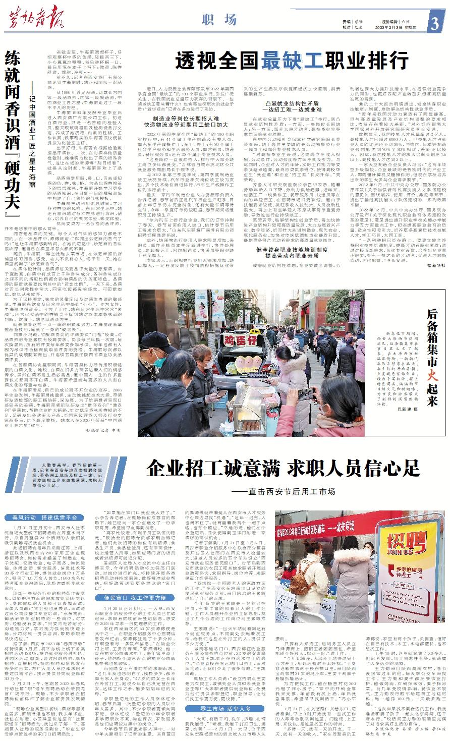 人勤春来早。春节后的第一周,记者在西安多地直击招聘会现场、劳务用工现场及招工一线。记者发现招工企业诚意满满,求职人员信心十足。春风行动 搭建供需平台 1月31日正月初十,西安市人社系统首场大型线下招聘活动在周至水街举行。来自周至县20个镇街的乡亲们被吸引到场寻找就业机会。 此场招聘会是年后来自江苏、上海、浙江以及陕西省内200家用工企业现场招聘会,岗位需求涵盖了制造业、电子装配、家政物业、电子商务、物流运输、休闲旅游、餐饮服务、信息技术等30多个行业工种,提供就业岗位1万多个,吸引了1.5万余人参会,1500余名应聘者和企业沟通后,现场达成初步就业意向。 现场一些服务行业的招聘条件很宽松,母婴护理方面的需求放宽到50岁以下、身体健康的人员都可以参加面试。面试人员说:“零经验也没关系,面试通过后公司会提供专业培训。”京东物流、御品轩等企业招聘的一些岗位,对学历、经验没有要求。“只要肯吃苦耐劳、沟通能力好、学习能力强就能快速上岗,公司将统一提供培训,帮助求职者尽快适应。” 据了解,西安市2023年“春风行动”将持续到3月底,将举办线上线下各类招聘活动138场,举办就业服务进社区、进园区活动80场,通过网络招聘、现场招聘、直播招聘、校园招聘和信息发布等多种形式,为广大用人单位和求职者搭建供需平台,预计提供各类就业岗位30万个。 2月2日上午,莲湖区2023年春风行动社区“职”通车招聘活动在荣民龙首广场举行。现场,不少求职者在招聘岗位前详细了解企业薪资及发展情况。 “现场企业类型以餐饮、酒店等服务业居多,薪酬待遇也不错,我去年毕业,就住在附近,小区群里说这里有‘社区职通车’招聘活动,就过来了解一下,莲湖区人社局的服务很到位。”毕业生李雪婷点赞这样的家门口招聘活动。 “如果能在家门口就业就太好了。”小李告诉记者,在现场岗位推荐官的帮助下,她已经向一家企业递交了一份求职简历,希望能早点得到消息。 “离家比较近,有利于员工队伍的稳定。”陕拾叁的招聘专员郝家瑞告诉记者,他们此次招聘的岗位有烘焙师、食品生产员、食品检验员,还有平面设计、线上运营人员等,如果应聘门店的店员或者烘焙师可就近分配。 莲湖区人社局人才交流中心主任白博表示,今年招聘活动将加强部门联动,对岗位进行扩充,将持续开展各类招聘活动并持续跟进,做好精准就业帮扶,把好政策送到更多群众的“家门口”。便民窗口 找工作更方便 1月28日正月初七。一大早,西安市职业介绍服务中心的工作人员已忙碌起来,求职者陆续前来登记信息,想要在2023年寻求一份更理想的工作。 家住西咸新区的53岁张师傅便是其中之一。在职业介绍服务中心招聘信息发布栏前,张师傅驻足了十多分钟,仔细查看每一条发布信息。“在物业公司上班,工资有保障。”张师傅说,他一直在物业公司做水电工,去年家里添了孙子,他想换个离家近点的物业公司既能挣钱也能顾家。 市民陆女士有着同样的求职诉求。“这几年我也想明白了,钱挣多少,都不如有家人在身边。”47岁的陆女士长年在外省打工,她说今年自己决定留在西安,这样工作之余,能多陪陪年迈的父母。” 求职登记处的工作人员李林红介绍,春节后第一批登记求职的人员以中年人居多。其中,不少求职者更倾向离家近。李林红说:“登记的中年求职者多学历层次不高,物业保安、家政服务是他们应聘较为集中的岗位。” 今年春节后首批求职人群中,一对中年夫妻吸引了记者的注意。来自蓝田的秦师傅就带着爱人在西安市人才服务中心周边寻找“机遇”。“这年一过完,人也闲不住了,就商量着我两个一起干点啥,也有个照应。”幸运的是,他们在中介登记后,很快便得到玉祥门附近一家酒店的面试机会。 记者了解到,1月31日至2月6日,西安市职业介绍服务中心联合部分区县及开发区人社部门在西安市人流量较大、返城人员较多的五个车站设立“西安市就业服务便民窗口”。对节后到西安市就业的农民工和其他求职者开展就业政策咨询、求职指导、岗位推荐、求职渠道介绍等服务。 “我想找一个照顾老人的家政方面的工作。”在西安火车站南出口设立的便民就业服务点前,来自陕北的王素霞说出了自己的诉求。 今年45岁的王素霞是一名养老护理员,有着丰富的照看老人的工作经验。工作人员翻开企业招工信息册,找出了几个合适的工作岗位向王素霞推荐。 王素霞说:“一出火车站就看到这有个就业服务点,不用到处去跑着找工作,给我们这些在外打工的人,提供了不少方便。” 城南客运站门口,西安锦江物业服务有限公司招聘点位前,22岁的安康籍务工人员王凯瑞正在咨询水电工的岗位。“企业直接在客运站门口招工,面对面沟通,让我们少走了很多弯路。”王凯瑞说。 现场工作人员说:“设立招聘点主要是为农民工、城镇失业人员和未就业毕业生等广大求职者提供就业岗位,免费为他们提供求职登记、职业指导,让他们找工作更方便,更快捷。”零工市场 活少人多 “大哥,有活干吗,洗车、拆墙、扎钢筋我能行。”“老板,我能干打扫卫生、摘菜、洗碗”……2月1日一大早,位于西安朱宏路杨善村的新北城人力市场人头攒动。 只要有人来招工,进城务工人员立马蜂拥而上,把招工者团团围住,希望能碰个好彩头,找到一份