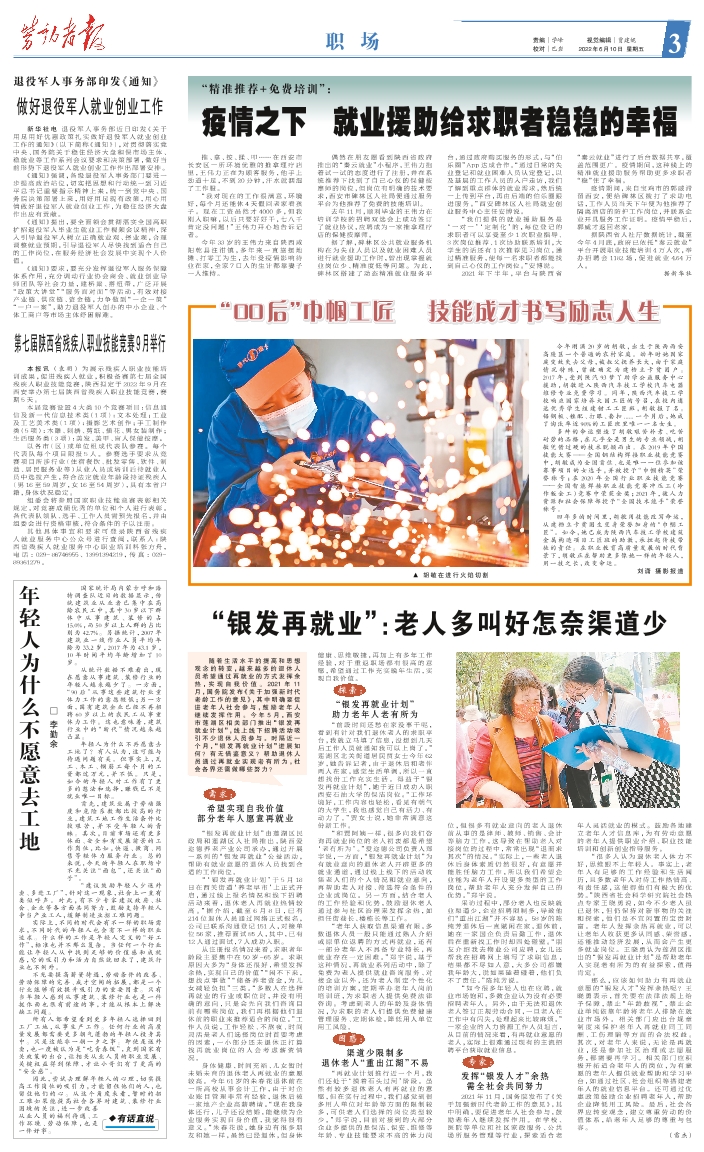随着生活水平的提高和思想观念的转变,越来越多的退休人员希望通过再就业的方式发挥余热,实现自我价值。2021年11月,国务院发布《关于加强新时代老龄工作的意见》,其中明确要促进老年人社会参与,鼓励老年人继续发挥作用。今年5月,西安市莲湖区相关部门推出“银发再就业计划”,线上线下招聘活动吸引不少退休人员参与。时隔近一个月,“银发再就业计划”进展如何?有无借鉴意义?帮助退休人员通过再就业实现老有所为,社会各界还需做哪些努力? 需求:希望实现自我价值部分老年人愿意再就业 “银发再就业计划”由莲湖区民政局和莲湖区人社局推出,陕西爱迩德养老产业公司承办,通过开展一系列的“银发再就业”公益活动,帮助有就业意愿的退休人员找到合适的工作岗位。 “‘银发再就业计划’于5月18日在西关街道‘养老早市’上正式开启,通过线上报名情况和线下招聘活动来看,退休老人再就业热情较高。”据介绍,截至6月 8 日,已有214位退休人员通过网络正式报名,公司已联系沟通登记151人,对接单位56家,推荐面试85人,其中,已有12人通过面试,7人成功入职。 从注册报名情况来看,求职者年龄段主要集中在50岁-65岁。求职原因大多为“身体还很好,希望发挥余热,实现自己的价值”“闲不下来,想找点事做”“储备养老资金,为儿女减轻负担”三类。“多数人在选择再就业的行业或职位时,并没有明确的意向,只是会先向我们咨询目前有哪些岗位,我们再根据他们退休前的职业来推荐适合的岗位。”工作人员说,工作轻松、不熬夜、时间灵活是老人们选择岗位时首要考虑的因素,一小部分还未退休正打算找再就业岗位的人会考虑薪资情况。 身体健康、时间充裕、儿女暂时未婚未育的退休老人再就业的意愿较高。今年61岁的朱春花退休前在一所高校从事会计工作,由于对企业账目管理非常有经验,退休后被一家地产企业高薪聘请。“现在我身体还行,儿子还没结婚,能继续为企业服务实现自身价值,我觉得很有意义。”朱春花说,她身边有很多朋友和她一样,虽然已经退休,但身体健康、思维敏捷,再加上有多年工作经验,对于重返职场都有很高的意愿,希望通过工作充实晚年生活,实现自我价值。 探索:“银发再就业计划”助力老年人老有所为 “前段时间还愁在家没事干呢,看到有针对我们退休老人的求职平台,我就立马填了信息,没想到几天后工作人员就通知我可以上岗了。”莲湖区北关街道居民贾女士今年62岁,她告诉记者,由于退休后和老伴两人在家,感觉生活单调,所以一直想找份工作充实生活。得益于“银发再就业计划”,她于近日成功入职西安石油大学的保洁岗位。“工作环境好,工作内容也轻松,看见有朝气的大学生,我也感觉自己有活力、有动力了。”贾女士说,她非常满意这份新工作。 “和贾阿姨一样,很多向我们咨询再就业岗位的老人初衷都是希望‘老有所为’。”爱迩德公司负责人郑宇说,一方面,“银发再就业计划”为有就业意向的退休老人开辟更多的就业通道,通过线上线下的活动收集老人们的个人情况和就业意向,再帮助老人对接、筛选符合条件的企业或岗位。另一方面,结合老人的工作经验和优势,鼓励退休老人通过参与社区治理来发挥余热,如担任街巷长、楼栋长等工作。 “老年人获取信息渠道有限,多数退休人员一般只能通过熟人介绍或原单位返聘的方式再就业,还有一部分老年人不具备专业特长,再就业存在一定困难。”郑宇说,基于这种情况,再就业系列活动中,除了免费为老人提供就业咨询服务、对接企业以外,还为老人制定个性化的培训方案,定期举办老年人岗前培训班,为求职老人提供免费法律咨询。考虑到老人的年龄及身体情况,为求职的老人们提供免费健康管理服务、定期体检,降低用人单位用工风险。 困惑:渠道少限制多退休老人“重出江湖”不易 “再就业计划推行近一个月,我们还处于‘摸着石头过河’阶段。虽然有较多退休老人有再就业的意愿,但在实行过程中,我们感觉到很多用人单位对年龄等方面的限制较多,可供老人们选择的岗位类型较少。”郑宇说,目前对接到的大部分企业多提供的是保洁、保安、维修等年龄、专业技能要求不高的体力岗位,但很多有就业意向的老人退休前从事的是律师、教师、销售、会计等脑力工作,这导致在帮助老人对接岗位的过程中,常常出现“退而求其次”的情况。“实际上,一些老人退休后身体素质仍然很好,有意愿并能胜任脑力工作,所以我们希望企业能为老年人开设更多类型的工作岗位,帮助老年人充分发挥自己的优势。”郑宇说。 采访过程中,部分老人也反映就业渠道少,企业招聘限制多,导致他们“重出江湖”并不容易。58岁的陈纯芳退休后一直赋闲在家,退休前,她在一家国企负责后勤工作,退休后在重新找工作时却四处碰壁。“朋友介绍我去物业公司应聘,女儿还帮我在招聘网上填写了求职信息,结果都不尽如人意,大多公司都嫌我年龄大,说如果磕着碰着,他们负不了责任。”陈纯芳说。 “如今很多年轻人也在应聘,就业市场饱和,多数企业认为没有必要招聘老年人。另外,由于无法和退休老人签订正规劳动合同,一旦老人在工作中有闪失,处理起来比较麻烦。”一家企业的人力资源工作人员坦言,从目前的情况来看,有再就业意愿的老人,实际上很难通过现有的主