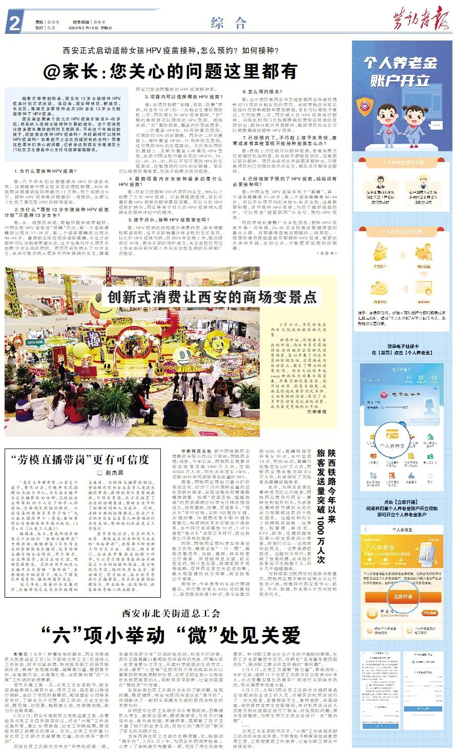 本报讯 (兰介) 伴着兔年的脚步,西安市莲湖区北关街道总工会(以下简称北关工会)迅速进入工作状态,拟计划谋新局,制定服务职工的新目标新任务,唱响“发现微问题、凝聚微力量、搭建微平台、实施微行动、点亮微心愿、实现微治理”的“六微”工作法的新春赞歌。 春节后复工第一天,北关工会主席程华、副主席潘越等深入辖区企业、项目工地、服务窗口等进行调研,走访了荣民控股集团、和润置业公司等多家单位,了解其生产经营、职工活动、企业文化状况,察民情、访民意,梳理微心愿、协调微治理,助力企业解难题。 2月2日,西安市莲湖区北关街道党工委、办事处及北关工会召开联席会议,讨论“六微”工作法实施方案,提出16项措施,划定工作路线图,推进服务职工新模式的落实。会后,北关工会所属11家社区工会联合会凝聚微力量,纷纷展开“微行动”。 自强社区工会联合会举办“开学防疫第一课,争做自强好少年”培训讲座活动,给孩子们讲解、演示正确佩戴口罩和使用消毒剂的方法,叮嘱大家一定要注意公共卫生,养成科学健康的生活方式。其间,辖区“小雷锋”还把用自己零花钱买来的口罩等防疫物品捐赠给社区,社区又把这些小礼物送给其他更需要的人,架起邻里互助桥,让爱的温度在“微服务”中传递。 龙首东南社区工会联合会主动了解问题、发现问题,搭建城管、物业与居民沟通交流“微平台”,协调解决了一起因车库漏水引起的居民与物业的矛盾纠纷。 宫园壹号社区工会联合会在寒假期间,召集辖区大学生、教师志愿者,搭建微课堂,为孩子们辅导作业、教书法绘画、学编织等,既照看了孩子又丰富了他们的业余生活,用贴心的“微行动”解决了家长的后顾之忧。 龙首西南社区工会联合会搭建警、社、校联动“微平台”,2月6日上午,为西安外国语学校第二小学上了法制教育专题第一课,增强了师生的法制意识。针对职工群众在生产生活中遇到的困难,社区工会主席屠建华表示,将孵化“龙首青年便民服务队”,解决职工群众所急所需的“微问题”。 2月6日,北关工会凝聚“微力量”,奉献热血,佑护生命,组织11个社区工会联合会志愿者200余人,在北关静安荟生活奥莱广场进行无偿献血活动,用点滴善举传递大爱。 2月7日,北稍门西社区工会联合会组织食品安全和消防安全工作人员,对辖区的托管班进行了一次大检查,查看厨房卫生、食材品质、消毒设施、消防器材及学生住宿情况,并对托管班从业人员是否持有健康证进行了核实,对发现的问题,责令及时整改,为学生学习生活安全进行一次“微治理”。 …… 北关工会主席程华表示,“六微”工作法服务职工活动将常态化开展,于细微处不断探索创新党建带工建、工建促党建工作品牌,让爱在职工群众中持续延伸。