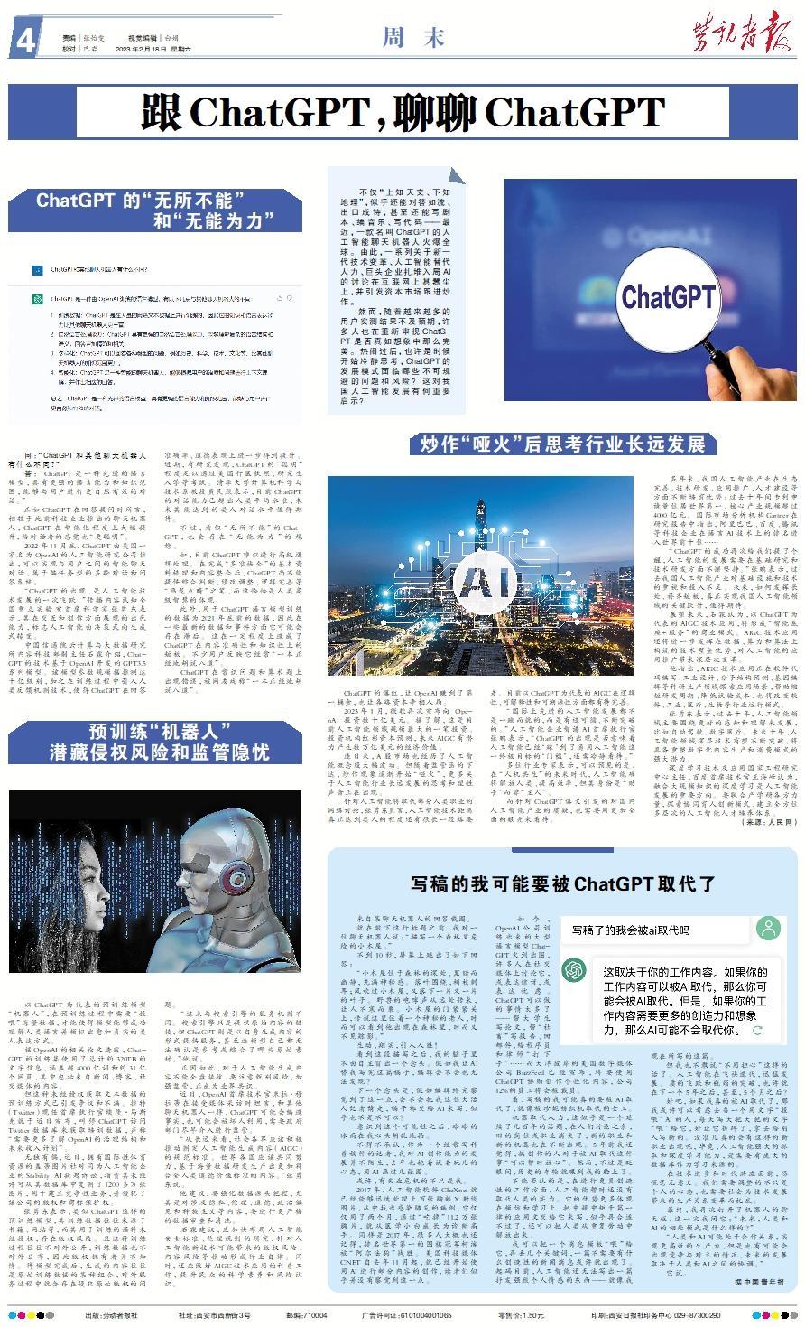 不仅“上知天文、下知地理”,似乎还能对答如流、出口成诗,甚至还能写剧本、编音乐、写代码——最近,一款名叫ChatGPT的人工智能聊天机器人火爆全球。由此,一系列关于新一代技术变革、人工智能替代人力、巨头企业扎堆入局AI的讨论在互联网上甚嚣尘上,并引发资本市场跟进炒作。 然而,随着越来越多的用户实测结果不及预期,许多人也在重新审视ChatGPT是否真如想象中那么完美。热闹过后,也许是时候开始冷静思考,ChatGPT的发展模式面临哪些不可规避的问题和风险?这对我国人工智能发展有何重要启示?ChatGPT 的“无所不能”和“无能为力” 问:“ChatGPT和其他聊天机器人有什么不同?” 答:“ChatGPT是一种先进的语言模型,具有更强的语言能力和知识范围,能够与用户进行更自然有效的对话。” 正如ChatGPT在回答提问时所言,相较于此前科技企业推出的聊天机器人,ChatGPT在智能化程度上大幅提升,给对话者的感觉也“更聪明”。 2022年11月底,ChatGPT由美国一家名为OpenAI的人工智能研究公司推出,可以实现与用户之间的智能聊天对话,属于偏任务型的多轮对话和问答系统。 “ChatGPT的出现,是人工智能技术发展的一次飞跃。”传播内容认知全国重点实验室首席科学家张勇东表示,其在交互和创作方面展现的出色能力,标志人工智能由决策式向生成式转变。 中国信通院云计算与大数据研究所内容科技部副主任石霖介绍,ChatGPT的技术基于OpenAI开发的GPT3.5系列模型。该模型参数规模据推测达十亿级别,加之在训练过程中引入人类反馈机制技术,使得ChatGPT在回答准确率、道德表现上进一步得到提升。近期,有研究发现,ChatGPT的“聪明”程度足以通过美国行医执照、研究生入学等考试。清华大学计算机科学与技术系教授黄民烈表示,目前ChatGPT的对话能力已超出人类平均水准,未来其能达到的类人对话水平值得期待。 不过,看似“无所不能”的ChatGPT,也会存在“无能为力”的尴尬。 如,目前ChatGPT难以进行高级逻辑处理。在完成“多准快全”的基本资料梳理和内容整合后,ChatGPT尚不能提供综合判断、修改调整、逻辑完善等“画龙点睛”之笔,而这恰恰是人类高级智慧的体现。 此外,用于ChatGPT语言模型训练的数据为2021年底前的数据,因此在一些最新的数据和事件方面它可能会存在滞后。这在一定程度上造成了ChatGPT在内容准确性和知识性上的短板。不少用户反映它经常“一本正经地胡说八道”。 ChatGPT在常识问题和算术题上出现错误,被网友戏称“一本正经地胡说八道”。预训练“机器人”潜藏侵权风险和监管隐忧 以ChatGPT为代表的预训练模型“机器人”,在预训练过程中需要“投喂”海量数据,才能使得模型能够成功理解人类语言并模拟出愈加真实的类人表达方式。 据OpenAI的相关论文透露,ChatGPT的训练集使用了总计约320TB的文字信息,涵盖超4000亿词和约31亿个网页,其中包括来自新闻、博客、社交媒体的内容。 但这种未经授权获取文本数据的预训练方式已引发争议和不满。推特(Twitter)现任首席执行官埃隆·马斯克就于近日宣布,叫停ChatGPT访问Twitter数据库来获取培训数据,声称“需要更多了解OpenAI的治理结构和未来收入计划”。 无独有偶,近日,拥有国际性体育资源的盖蒂图片社对同为人工智能企业的Stability AI提起诉讼,指责其未经许可从其数据库中复制了1200多万张图片,用于建立竞争性业务,并侵犯了该公司的版权和商标保护权。 张勇东表示,类似ChatGPT这样的预训练模型,其训练数据往往来源于书籍、网站等,而其用于训练的语料未经授权,存在版权风险。且这种训练过程往往不对外公开,训练数据也不对外公布,因此版权拥有者并不知情。待模型完成后,生成的内容往往是原始训练数据的某种组合,对外服务过程中就会存在侵犯原始版权的问题。 “这点与搜索引擎的服务机制不同。搜索引擎只是提供原始内容的链接,但ChatGPT则是以自身生成内容的形式提供服务,甚至连模型自己都无法确认是参考或综合了哪些原始素材。”他说。 正因如此,对于人工智能生成内容不能全盘接收,要注意甄别风险、加强监管,正成为业界共识。 近日,OpenAI首席技术官米拉·穆拉蒂在接受媒体采访时坦言,和其他聊天机器人一样,ChatGPT可能会编造事实,也可能会被坏人利用,需要政府部门尽早介入进行监管。 “从长远来看,社会各界应该积极推动制定人工智能生成内容(AIGC)的规范标准。世界各国应该共同努力,基于海量数据研发生产出更加符合全人类道德价值标准的内容。”张勇东说。 他建议,要强化数据源头把控,尤其是对涉及隐私、伦理、道德、政治偏见和种族主义等内容,要进行更严格的数据审查和清洗。 石霖建议,应加快布局人工智能安全标准、伦理规则的研究,针对人工智能新技术可能带来的版权风险、内容风险等推动形成行业自律。同时,还应做好AIGC技术应用的科普工作,提升民众的科学素养和风险认识。炒作“哑火”后思考行业长远发展 ChatGPT的爆红,让OpenAI赚到了第一桶金,也让各路资本争相入局。 2023年1月,微软再次宣布向 OpenAI 投资数十亿美元。据了解,这是目前人工智能领域规模最大的一笔投资。投资机构红杉资本预测,未来AIGC有潜力产生数万亿美元的经济价值。 连日来,A股市场也经历了人工智能概念股大幅波动。但随着监管函的下达,炒作现象逐渐开始“哑火