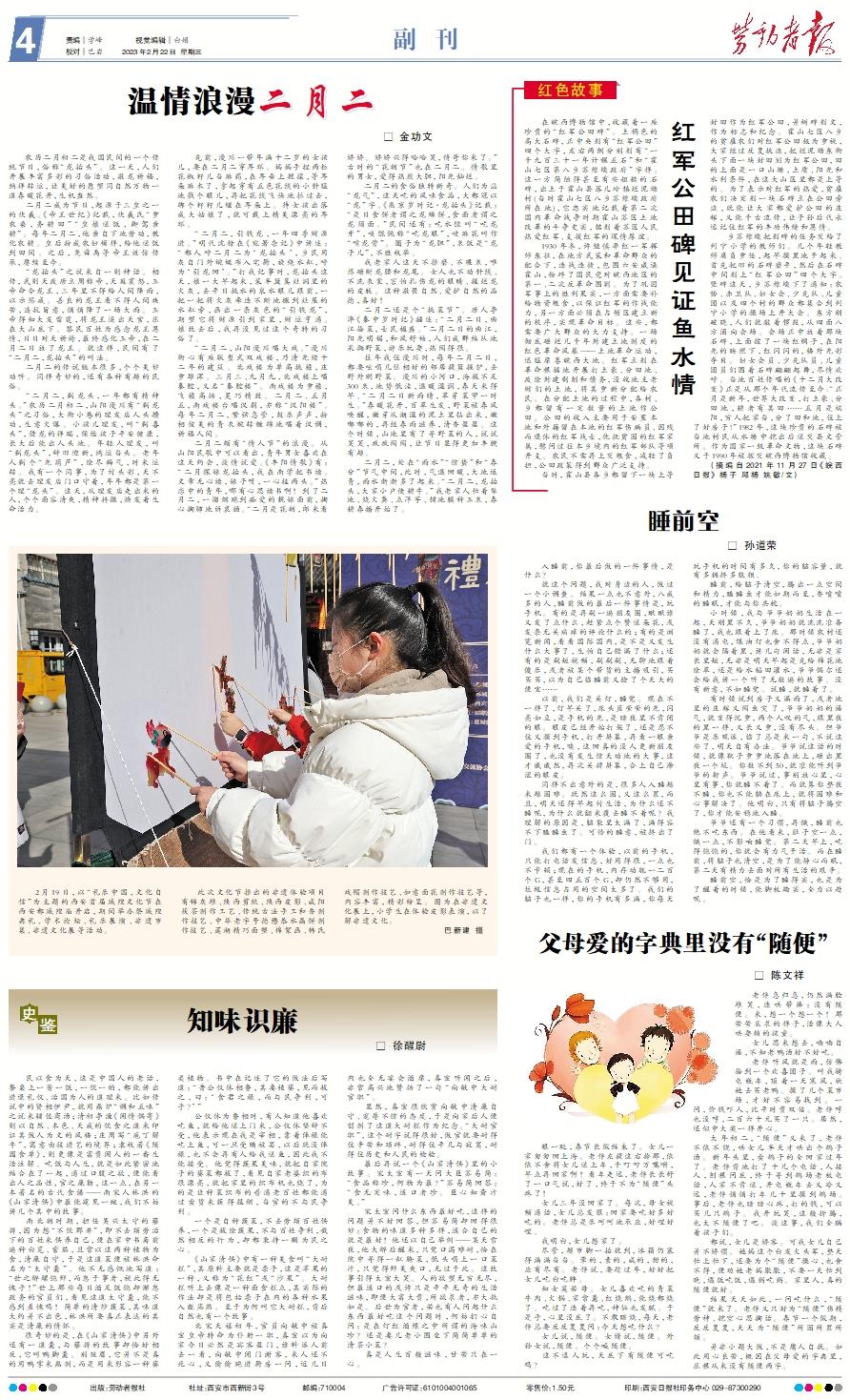 农历二月初二是我国民间的一个传统节日,俗称“龙抬头”。这一天,人们开展丰富多彩的习俗活动,敬龙祈福,纳祥转运,让美好的愿望同自然万物一道春暖花开,生机盎然。 二月二成为节日,起源于三皇之一的伏羲。《帝王世纪》记载,伏羲氏“重农桑,务耕田”“皇娘送饭,御驾亲耕”。每年二月二,他亲自下地劳动,教化农耕。皇后扮成农妇模样,给他送饭到田间。之后,尧舜禹等帝王效仿传承,赓续至今。 “龙抬头”之说来自一则神话。相传,武则天废唐立周称帝,天庭震怒,玉帝命令龙王,三年里不得给人间降雨,以示惩戒。善良的龙王看不得人间疾苦,违抗旨意,悄悄降了一场大雨。玉帝得知大发雷霆,将龙王逐出天宫,压在大山底下。黎民百姓为感念龙王恩情,日日对天祈祷,最终感化玉帝,在二月二日放了龙王。就这样,民间有了“二月二,龙抬头”的叫法。 二月二的传说版本很多,个个美妙动听。同样奇妙的,还有各种有趣的民俗。 “二月二,剃龙头,一年都有精神头。”农历二月初二,山阳漫川有“剃龙头”之习俗,大街小巷的理发店人头攒动,生意火爆。小孩儿理发,叫“剃喜头”,借龙的祥瑞,保佑孩子平安健康,长大后能出人头地。年轻人理发,叫“剃龙头”,辞旧迎新,鸿运当头。老年人剃个“光葫芦”,除尽晦气,时来运转。我有一个同事,为了讨头彩,天不亮就去理发店门口守着,年年都是第一个理“龙头”。这天,从理发店走出来的人,个个面容清爽,精神抖擞,焕发着生命活力。 先前,漫川一带年满十二岁的女孩儿,要在二月二穿耳环。妈妈手捏两粒花椒籽儿当麻药,在耳垂上摁揉,等耳朵麻木了,拿起穿有五色花线的小针猛地戳个眼儿,再把花线飞快地拉过去,绑个籽籽儿缀在耳朵上。待女孩出落成大姑娘了,就可戴上精美漂亮的耳环。 “二月二,引钱龙,一年四季财源进。”明代沈榜在《宛署杂记》中讲述:“都人呼二月二为‘龙抬头’,乡民用灰自门外蜿蜒布入宅厨,旋绕水缸,呼为‘引龙回’。”打我记事时,龙抬头这天,娘一大早起来,装半簸箕灶洞里的火灰,去平日挑水的泉水眼儿跟前,一把一把将火灰牵连不断地撒到灶屋的水缸旁,画出一条灰色的“引钱龙”,期望它将财源引到家里,财运亨通。娘故去后,我再没见过这个奇特的习俗了。 “二月二,山阳漫川唱大戏。”漫川街心有座联璧式双戏楼,乃清光绪十二年的建筑。北戏楼为单高挑檐,庄重雄浑。三月三、九月九,北戏楼上唱秦腔,又名“秦腔楼”。南戏楼为重檐,飞檐高扬,灵巧精致。二月二、五月五,南戏楼台唱汉剧,亦称“汉阳楼”。每年二月二,繁弦急管,鼓乐声声,扮相俊美的青衣婉转缠绵地唱着汉调,祈福人间。 二月二颇有“情人节”的浪漫。从山阳民歌中可以看出,青年男女喜欢在这天约会,谈情说爱。《丰阳情歌》有:“二月探妹龙抬头,我在南学把书读。文章无心读,妹子呀,一心挂两头。”热恋中的青年,哪有心思读书啊!到了二月二,一溜烟跑到痴爱的靓妹面前,掏心掏肺地诉衷肠。“二月是花朝,郎来看娇娇。娇娇兴得哈哈笑,情哥你来了。”古时的“花朝节”也在二月二。情歌里的男女,爱得热烈大胆,阳光灿烂。 二月二的食俗独特新奇。人们为沾“龙气”,这天吃的风味食品,大都冠以“龙”字。《燕京岁时记·龙抬头》记载:“是日食饼者谓之龙鳞饼,食面者谓之龙须面。”民间还有:吃水饺叫“吃龙牙”,啖馄饨称“吃龙眼”,咬麻花叫作“啃龙骨”。圆子为“龙胆”,米饭是“龙子儿”,不胜枚举。 我老家人这天不推磨、不碾米,唯恐砸断龙腰和龙尾。女人也不动针线、不洗衣裳,害怕扎伤龙的眼睛、搓烂龙的皮肤。这种敬畏自然、爱护自然的品德,真好! 二月二还是个“挑菜节”。唐人李淖《秦中岁时记》描述:“二月二日,曲江拾菜,士民楹盛。”二月二日的曲江,阳光明媚,和风舒畅,人们成群结队地采撷野菜,游乐玩耍,热闹得很。 往年我住漫川时,每年二月二日,都要吆喝几位相好的邻居提篮握铲,去野外剜野菜。漫川的小河口,海拔不足300米,地势低洼,温暖湿润,春天来得早。“二月二日新雨晴,草芽菜甲一时生。”春暖花开,百草生发,野菜被春风唤醒,嫩芽从潮湿的泥土里钻出来,嫩嘟嘟的,再经春雨滋养,清香盈盈。这个时候,山地里有了寻野菜的人,说说笑笑,疯疯闹闹,让节日显得更加丰腴有趣。 二月二,处在“雨水”“惊蛰”和“春分”节气中间,此时,气温回暖,大地返青,雨水渐渐多了起来。“二月二,龙抬头,大家小户使耕牛。”我老家人忙着犁地、烧火粪、点洋芋、铺地膜种玉米,春耕春播开始了。