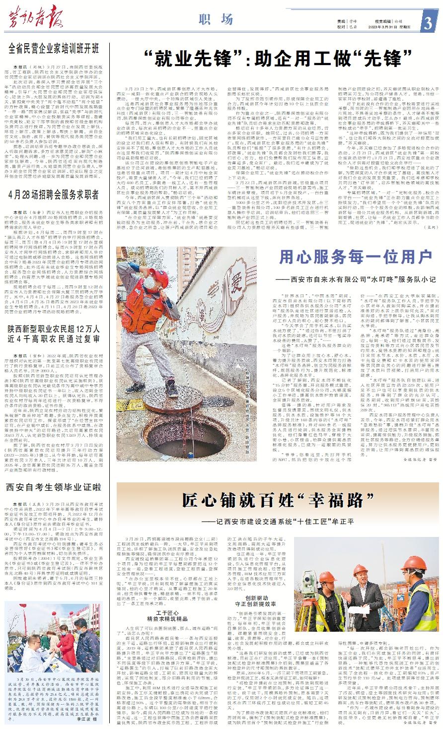 3月23日上午,西咸新区秦创原人才大市场,西安—咸阳一体化重点产业联合招聘会现场人头攒动。一楼大厅中央,一个特殊的区域引人关注。 这是西咸新区社会事业服务局为当地部分重点企业专门设置的招聘区域,聚集了隆基乐叶光伏科技(西咸新区)有限公司、三一智能装备有限公司、陕西秦深维创实业有限公司等企业。 每周四、周六,秦创原人才大市场都会举办就业洽谈会,每次前来招聘的企业不一,但重点企业的招聘区域常态化设立。 “我们用工量大,也有长期招聘计划,固定区域的设立对我们招人很有帮助。有时候我们有其他安排来不了现场,秦创原人才大市场的工作人员就在这里帮我们收简历。”陕西秦深维创实业有限公司总裁助理杨培培说。 该公司正在建设的秦创原创维智能电子产业基地位于泾河新城,是创维集团的生产配套基地,也是省级重点项目。项目一期计划4月中旬全面投产,需要大量储备人才。“今年,我们已经招聘了大约400名员工,多数是一线工人,还有一些管理人员。成功招聘到我们的目标人才,离不开西咸新区社会事业服务局的帮助。”杨培培说。 今年,西咸新区深入贯彻陕西“三个年”活动和西安八个方面重点工作安排部署,打造“就业先锋”就业服务品牌,以“群众就业促增收、企业用工有保障、高质量发展聚人才”为工作目标。 “在企业用工保障方面,‘就业先锋’就是要变被动服务为主动服务,冲在前、干在先,想企业之所想、急企业之所急,让落户西咸新区的项目和企业留得住、发展得好。”西咸新区社会事业服务局副局长赵宏庆说。 为了发挥示范引领作用,形成保障企业用工的合力,西咸新区今年计划打造10个以上优质企业服务样板。 作为重点企业之一,陕西秦深维创实业有限公司不仅有专属招聘区域,还有“一对一”服务的“就业先锋”队员结合需求主动匹配资源和政策。 杨培培有十多年人力资源方面的从业经历,曾在多家企业任职。她回忆,过去,公司招聘一方面依靠网络招聘软件,一方面要自己做公众号宣传推广;现在,西咸新区社会事业服务局的“就业先锋”队员帮他们“链接”了很多资源。“有什么招聘会、好政策,‘就业先锋’队员都会及时给我们推荐,我们省心、省力。他们免费帮我们发布用工信息,宣传渠道多、受众面广。最近,我们还申请成为了就业见习基地。”杨培培说。 保障企业用工,“就业先锋”还在推动校企合作上下功夫。 3月22日,西咸新区沣西新城,省级重点项目——三一智能制造产业园建设现场机器轰鸣,施工车辆往来穿梭。项目将于5月全面投产,一台台重型机械将从这里下线,奔向世界各地。 1000多公里之外,沈阳经济技术开发区,在三一重型装备有限公司,100多名新员工正在进行机器人操作手培训。培训结束后,他们将返回三一智能制造产业园正式上岗。 回忆起这些员工的招聘经历,三一智能装备有限公司人力资源经理齐天霸有些感慨。三一智能制造产业园建设之初,齐天霸试图从职业院校入手招聘实习生,为公司投产储备人才。但是,当他一家家拜访学校时,却遭遇了尴尬。 对于此前没有合作的企业,学校需要进行实地考察,而当时的三一智能制造产业园所在地尚是一片荒地,不具备实地考察的条件。人才储备不能等到项目建成后才动手,怎么办?最终,在西咸新区社会事业服务局的牵线搭桥下,齐天霸和其中一些学校成功“牵手”,招聘到第一批实习生。 “这种牵线搭桥,既为我们提供了一种信用‘背书’,也让我们和各大院校之间的交流对接更加便捷。”齐天霸说。 今年,齐天霸已经参加了多场促进校企合作的活动。2月21日,西咸新区“就业先锋”第一期校企座谈活动举行;3月21日,西安地区重点企业政校企人才供需对接暨经验交流会举行…… “借助这些机会,我们和学校增进了彼此的了解,为更深度的人才合作奠定了基础。高技能人才对我们企业的发展至关重要。我们还考虑和学校共同打造‘订单班’,培养智能制造领域的高技能人才。”齐天霸说。 专属招聘区域、“一对一”定制化服务、校企合作平台……“就业先锋”正在助力重点企业用工上持续发力。“我们希望用一个个‘就业先锋’队员的实际行动,用一个个服务企业的样板,去影响西咸新区每一级公共就业服务机构。从新区到新城,再到街镇、社区,让每一名就业工作人员都争当助企用工、促进就业的‘先锋’。”赵宏庆表示。 (孟珂)