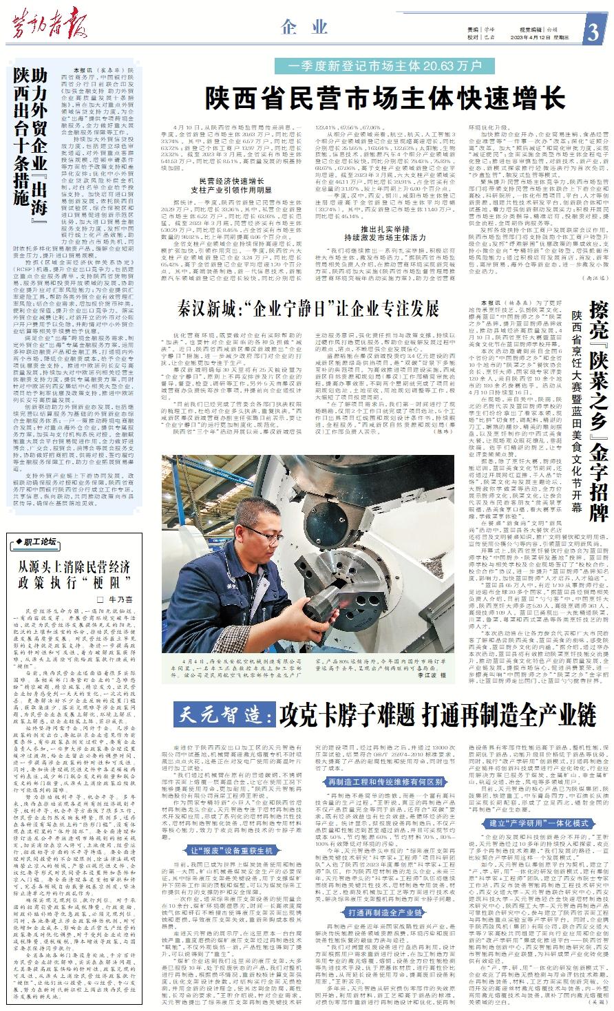 4月10日,从陕西省市场监管局传来消息,一季度,全省新登记市场主体20.63万户,同比增长33.74%。其中,新登记企业6.57万户,同比增长63.72%;新登记个体工商户13.97万户,同比增长23.32%。截至2023年3月底,全省实有市场主体541.53万户,同比增长8.51%,高质量发展的根基持续加固。民营经济快速增长支柱产业引领作用明显 据统计,一季度,陕西省新登记民营市场主体20.29万户,同比增长33.36%,其中,私营企业新登记市场主体6.22万户,同比增长63.93%,增长迅猛。截至2023年3月底,民营经济实有市场主体530.79万户,同比增长8.45%,占全省实有市场主体数量的98.02%,比上年同期提高0.06个百分点。 全省支柱产业领域企业持续保持高速增长,规模扩张加快,引领作用突出。一季度,陕西省六大支柱产业领域新登记企业3.24万户,同比增长65.42%,高于全省新登记企业平均增速1.70个百分点。其中,高端装备制造、新一代信息技术、新能源汽车领域新登记企业增长较快,同比分别增长123.41%、67.56%、67.06%。 从细分产业领域来看,航空、航天、人工智能3个细分产业领域新登记企业呈现超高速增长,同比分别增长251.65%、163.64%、122.63%;太阳能、生物质能、信息技术、新能源汽车4个细分产业领域新登记企业增长较快,同比分别增长79.43%、75.83%、68.67%、67.06%,高于支柱产业领域新登记企业平均增速。截至2023年3月底,六大支柱产业领域实有企业46.11万户,同比增长39.91%,占全省实有企业总量的31.87%,较上年同期上升6.00个百分点。 一季度,汉中、西安、铜川、咸阳市场主体登记注册增速高于全省新登记市场主体平均增幅(33.74%)。其中,西安新登记市场主体11.40万户,同比增长45.14%。推出扎实举措持续激发市场主体活力 “我们将继续推出一系列扎实举措,积极培育壮大市场主体,激发市场活力。”据陕西省市场监管局相关负责人介绍,在推动营商环境实现新突破方面,陕西将加大实施《陕西省市场监督管理局推进营商环境突破年活动实施方案》,助力全省营商环境优化升级。 加快推动企业开办、企业简易注销、食品经营企业准营等“一件事一次办”改革;深化“证照分离”改革。加大“照后减证”和简化审批力度,实现“减证便民”;全面实施全类型市场主体全程电子化登记;推进包容审慎监管,对新技术、新产业、新业态、新模式探索推行轻微违法行为首次免罚、“沙盒监管”、触发式监管等模式。 聚焦提升民营市场主体竞争力,陕西市场监管部门将带领支持民营市场主体联合上下游企业和高校、科研院所,一体化布局项目、平台、人才等创新资源,组建共性技术研发平台、创新联合体和中试基地,着力增强创新驱动发展实力;积极开展民营市场主体分类指导、精准培育、投融资对接,提供全流程、全周期咨询服务等。 发挥各级扶持个体工商户发展联席会议作用,陕西市场监管部门将支持鼓励个体工商户转型升级企业;发挥“纾难解困”优惠政策的集成效应,支持小微企业向“专精特新”企业转型,增强抵御市场风险能力;通过积极培育发展首店、首发、新零售、离岸贸易、海外仓等新业态,进一步激发小微企业活力。 (南江远)