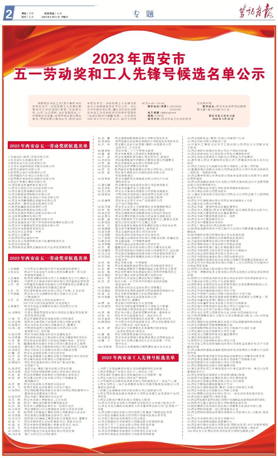根据西安市总工会《关于做好2023年西安市五一劳动奖和工人先锋号推荐命名工作的通知》要求,为体现公开、公平、公正原则,充分发扬民主,广泛接受社会监督,实现评选过程让群众参与、评选结果让群众认可,现将2023年西安市五一劳动奖和工人先锋号拟命名人选和候选单位予以公示。对公示名单持有异议者,请以实名方式向西安市总工会经济技术劳动保护部反映(信函以到达日邮戳为准)。公示期为2023年4月21日至26日,每日工作时间为9:00—18:00。 联系电话(传真):87221590 87221591 电子邮箱:jjb@xagh.net 邮编:710018 收件单位:西安市总工会经济技术劳动保护部 联系地址:西安市未央区明光路凯瑞大厦I座1210或1211室 西安市总工会办公室 2023年4月20日2023年西安市五一劳动奖状候选名单1.华联SKP(陕西)百货有限公司2.比亚迪汽车金融有限公司3.德创未来汽车科技有限公司4.北方长龙新材料技术股份有限公司5.陕西天诚软件有限公司6.陕西西北金行有限责任公司7.陕西重型汽车进出口有限公司8.陕西源杰半导体科技股份有限公司9.西安汇智医疗集团有限公司10.西安格美金属材料有限公司11.西安吉利优行汽车科技有限公司12.西安曲江建设集团有限公司13.西安瑞联新材料股份有限公司14.西安市浐灞生态房地产开发有限公司15.西安市西糖烟酒连锁超市有限公司16.陕西同一医药连锁有限责任公司17.陕西金翼服装有限责任公司18.陕西康佳智能家电有限公司19.西安奕斯伟材料科技股份有限公司20.亚玄建设集团有限公司21.西安未央城市建设集团有限公司22.西安通益房地产资产评估测绘咨询集团有限公司23.西安市幸福路地区开发建设有限公司24.西安市发展和改革委员会25.西安市长安区第一中学26.西安工会医院27.陕西省西安爱知中学28.西安市人民政府国有资产监督管理委员会29.西安市殡仪馆30.国家税务总局西安高新技术产业开发区税务局2023年西安市五一劳动奖章候选名单1.任舜鹏 中车西安车辆有限公司产品制造部机修钳工2.陈宝庆 西安中车永电电气有限公司机加事业部一机车间维修组机修钳工3.王海新 陕西黄河集团有限公司三车间数控加工中心操作工4.王福松 中联西北工程设计研究院有限公司华盛院总建筑师5.何 潜 中国重型机械研究院股份公司管棒型材工程事业部管棒型材装备研究所高级工程师6.王 军 西安康明斯发动机有限公司生产经理、工会主席7.牛晓霞 西安市公共交通集团有限公司第六分公司17路驾驶员8.王 朵 国网西安供电公司变电运维中心330千伏北郊变电运维班 变电运维工9.袁海宾 西安市轨道交通集团有限公司运营分公司变电检修工10.刘秀强 中建七局第四建筑有限公司团结安置社区及配套项目部项目经理11.郑 军 西安市高陵区韵达快递有限公司快递员12.李宣霖 陕西省空港民航产业投资有限公司副总经理13.雷春元 西安市自来水有限公司党委书记、董事长14.梁二雷 中国建筑第四工程局有限公司西北分公司党委副书记、总经理15.赵长勇 西安市消防救援支队防火监督处处长16.李建锋 西安新鼎尚电力工程有限公司电力稽查维护班班长17.刘 鹏 西安热电有限责任公司发电部锅炉专业一班班长18.宁 旭 隆基绿能科技股份有限公司切片高级主任工程师19.陈延安 清华德人西安幸福制药有限公司工程部电气工程师20.张林生 西安元创化工科技股份有限公司副总经理21.魏 涛 西安大业食品有限公司车间主任22.卫 涛 西安爱菊粮油工业集团有限公司油脂分装车间主任23.王 佳 西安海外旅游有限责任公司高级导游24.杨嘉兴 西安方欣食品有限公司冷冻厂副总经理、常务副厂长25.韩卓军 金花企业(集团)股份有限公司总经理26.叶达勇 西安五环非织造材料有限公司水刺车间主任27.张 斌 西安纺织集团有限责任公司织造车间保全工28.张 辉 西安惠大化学工业有限公司生产部整备室高级操作工29.王 鹏 西安印钞有限公司检封车间主任30.申 飞 陕西伊利乳业有限责任公司生产组长31.韩国宏 西安国际医学投资股份有限公司西安国际医学中心医院消化病医院执行院长32.张世荣 西安市第三医院神经外科主任33.王 群 西安市凤景小学副校长、工会主席34.林 晨 西安广播电视台媒资音像部副主任35.白 明 西安市儿童医院泌尿外科一病区科主任36.乌军河 西安唐都进口汽车修理服务有限公司技术经理37.刘 颖 陕西建工机械施工集团有限公司党政办公室主任38.邓邦莲 西安联邦口腔医院党支部书记、院长39.王安华 陕西建工机械施工集团有限公司党委书记、董事长40.赵 宇 西安市碑林区太白社区党委书记、居委会主任41.胡 兵 西安市碑林区雁塔路小学党支部书记、校长42.彭 华 西安市碑林区疾病预防控制中心主任43.许和兴 陕西华银电力实业发展有限公司总经理44.冯天雷 饿了么西安分公司送餐员45.刘 静 西安成城裕朗商贸有限公司酒水部业务员46.周新琪 陕西昱鑫科技发展有限责任公司研发技术部技术员47.石 林 西安惠心亚态企业管理(集团)有限责任公司支部书记、工会主席48.姚景利 西安市第二十三中学语文教师49.董 超 西安市雁塔区人民法院立案庭副庭长50.卢 焱 西安市雁塔区翠华路小学支部书记、副校长51.李洪洁 西安雁塔能康中西医结合医院有限公司董事长52.周 超 西安汉城湖实业有限公司维修主管53.王跃东 陕西宝伦律师事务所律师54.邢 龙 陕西威达机械制造股份有