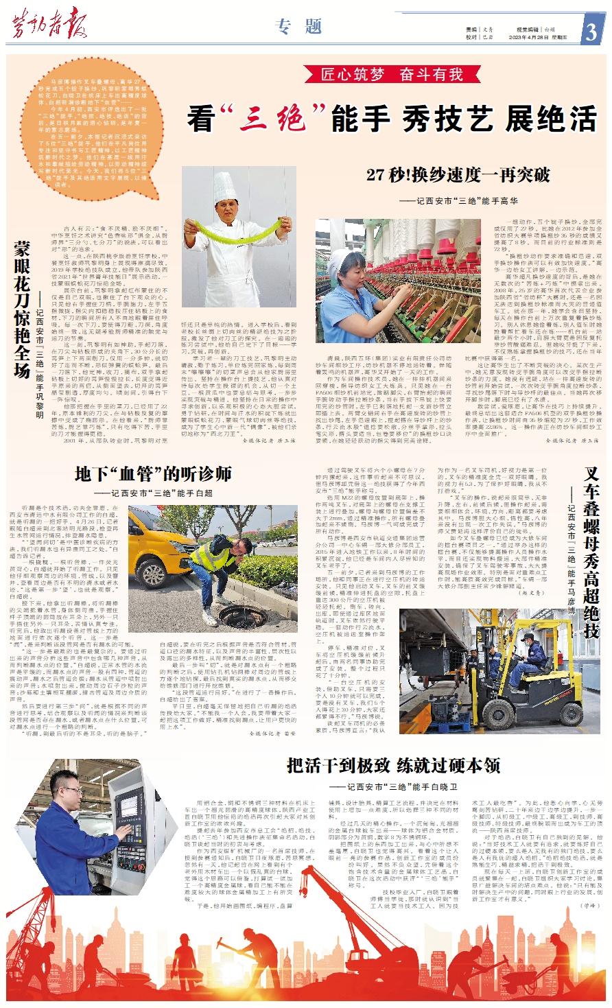 马彦博操作叉车叠螺母、高华27秒完成五个锭子换纱、巩黎明蒙眼秀蜈蚣花刀、白晓卫在机床上车出高精度球体、白超听漏诊断地下“血管”…… 今年4月初,西安市评选出了一批“三绝”能手,“绝招、绝技、绝活”的背后,是日积月累的潜心钻研,是年复一年的意志磨练。 在五一前夕,本报记者沉浸式采访了5位“三绝”能手,他们在平凡岗位用专注和坚守书写工匠精神,以工匠精神筑新时代之梦。他们在基层一线用汗水和奉献描绘劳动精神,以劳动精神续写新时代荣光。今天,我们将5位“三绝”能手及其绝活用文字展现,以飨读者。蒙眼花刀惊艳全场——记西安市“三绝”能手巩黎明 古人有云:“食不厌精,脍不厌细”。中华烹饪之术讲究“色香味形”俱全,从厨师界“三分勺,七分刀”的说法,可以看出对“形”的追求。 这一点,在陕西桃李旅游烹饪学校,中餐烹饪教师巩黎明身上展现得淋漓尽致。2019年学校绝技队成立,他带队参加陕西省2021年“世界青年技能日”展示活动,一技蒙眼蜈蚣花刀惊艳全场。 展示台前,巩黎明拿起红布蒙住的不仅是自己双眼,也揪住了台下观众的心。只见他右手握住刀柄,手腕施力,左手五指微拢,指尖内扣稳稳按压住砧板上的食材,下刀的瞬间所有人不由地跟着屏住呼吸。每一次下刀,要使得刀距、刀深、角度始终一致,这无疑考验厨师精准的触觉与运刀的节奏。 这一刻,巩黎明有如神助,手起刀落,在刀尖与砧板形成的夹角下,30公分长的莴笋上下两面剞刀,仅用一分多钟,就切好了连而不断,形似弹簧的蜈蚣笋。最后一刀落下,他定神,收刀、摘布,双手拿起砧板上切好的莴笋慢慢拉长,长度变得近乎原来的两倍,从侧面望去,切开的莴笋晶莹剔透,厚度均匀。顷刻间,引得台下一阵惊叹。 他那把握在手里的菜刀,已经用了22年,原本锋利的刀尖,在与砧板反复的摩擦中变成了椭圆形。在他看来,“厨师靠苦练,厨艺靠巧练”,只有吃得下苦,手里的刀才能握得更稳。 2001年,从部队转业时,巩黎明对烹饪还只是单纯的热情。进入学校后,看到老校长丝绸上切肉丝的精湛绝技为之折服,激发了他对刀工的探究。在一遍遍的练习尝试中,他给自己定下了目标——学习,突破,再创新。 学习老一辈的刀工技艺,巩黎明主动请教,勤于练习,单位练完回家练,每到周末“嚓嚓嚓”的切菜声总会从他家厨房里传出。坚持在操作台上提技艺,他认真对待每次给学生授课的机会,从切一个土豆、一根黄瓜中也要总结与思考,一步步实现突破与精进。他坚持在日常的操作中寻求创新,以乐观积极的心态大胆尝试,勇于钻研,在时间与汗水的积淀下练就出蒙眼蜈蚣花刀、蒙眼气球切肉丝等绝技,成为了学生心中新一代“偶像”,被他们亲切地称为“西北刀王”。 全媒体记者 唐玉洁27秒!换纱速度一再突破——记西安市“三绝”能手高华 清晨,陕西五环(集团)实业有限责任公司纺纱车间细纱工序,纺纱机器不停地运转着。伴随着轰鸣的机器声,高华又开始了一天的工作。 作为车间操作技术员,她在一排排机器间来回穿梭,指导纺织女工大练兵。只见她在一台FA506细纱机前站定,微踮脚尖,右臂抬起的瞬间手腕转动手指拉断纱条,当右手拔下吊锭上快要用完的纱管时,左手已利落地托起一支新纱管立即插上去。两臂交错间右手在高速旋转的纱管上找出纱尾,左手迅速跟上,捏起搭在导纱杆上的纱条,行云流水般“退捻要松散、分丝手掌形、拉头笔尖形、搭头要适当、包卷要移位”的换粗纱口诀要领,在她轻轻跃动的指尖得到完美诠释。 一组动作,五个锭子换纱,全部完成仅用了27秒。比她在2012年参加全省纺织大赛单项换粗纱35秒的成绩又提高了8秒。而目前的行业标准则是72秒。 “换粗纱动作要求准确和迅速,双手换纱操作法可以有效加快速度。”高华一边给女工讲解,一边示范。 高华超凡换纱速度的背后,是她在无数次的“苦练+巧练”中摸索出来。2008年,25岁的高华首次代表企业参加陕西省“省纺杯”大赛时,还是一名因无法达到换粗纱标准而大哭的普通值车工。就在那一年,她学会含泪坚持,每天在操作台前上万次重复着换纱练习。别人休息她偷着练,别人值车时她抢着帮忙看车还在练……机台前一站最少两个小时,肩膀大臂更是因反复托举纱管酸痛难忍。但她咬牙挺了下来,不仅熟练掌握换粗纱的技巧,还在当年比赛中获得第一名。 这让高华生出了不断突破的决心。某次生产中,她无意发现转变手腕角度可以改变手指拉断纱条的力度。她没有迟疑,站在一排高速旋转的纱管前开始尝试,一次次转变手腕角度拉断纱条,寻找纱尾落下时与导纱杆的最佳点。当她再次移开脚步时,脚底已经有了水渍。 敢尝试,爱琢磨,让高华在技巧上持续提升。最终总结出这套适合FA506机型的双手换粗纱操作法,让换粗纱时间由35秒缩短为27秒,工作效率提高22.86%。这一操作法正在纺纱车间细纱工序中全面推广。 全媒体记者 唐玉洁地下“血管”的听诊师——记西安市“三绝”能手白超 听漏是个技术活,功夫全靠磨。在西安市清远中水有限公司工作的白超,就是听漏的一把好手。4月26日,记者跟随白超来到北客站明光路段,检查再生水管网运行情况,排查漏水隐患。 “‘望闻问切’是中医诊断疾病的方法,我们听漏水也有异曲同工之处。”白超告诉记者。 一根撬棍、一根听音棒、一件荧光黄背心,白超就