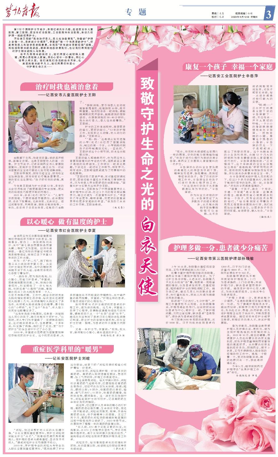 第112个国际护士节前夕,本报记者兵分几路,走进西安市儿童医院、第三医院、西安市红会医院、工会医院和长安医院,采访几位护理一线的优秀护士。 不论是王阳的“我在治疗患儿,患儿也治愈着我”,孙晓敏的“护理上多做一分,患者就少分痛苦”,李夏的”做一个有温度的护士“,还是看到患儿有进步患者得康复,辛岳萍“所有的辛苦都值得“感慨,刘暄感到职业的成就感,都深深地感动着我们,也让我们看到他们对护士职业的投入与执着。 在平凡而艰辛的岗位上,他们用爱心减轻病人痛楚,用真心温暖病人家属,用忠心坚守一份事业,用仁心诠释人间大爱。他们是我们身边的白衣天使,也是爱岗敬业的平凡人,他们用责任和爱心守护着生命之光……治疗时我也被治愈着——记西安市儿童医院护士王阳 走路脚下生风,快速且轻盈;说话柔声细语,温暖又亲和。这是王阳留给人的第一印象。护士节前夕,记者来到西安市儿童医院康复科,见到护士王阳时,她正在为一位前来康复的宝宝进行婴幼儿发育促进操训练。 王阳面带微笑,时而引逗宝宝,时而给宝宝加油鼓劲,时而给家长叮嘱注意事项,一旁的家长连连赞叹:“孩子好听你的话哦,真好。” 今年是王阳成为护士的第12年,多年的从业经历练就了她更高超的专业技能,更实用的沟通技巧和更平和的同理心。 2021年,乐乐(化名)因为“六一”儿童节表演舞蹈,下腰时造成脊髓损伤,送来医院时,乐乐下肢瘫痪,无法排尿,无法站立。通过间歇导尿、判断尿液、膀胱功能训练等,一年后,乐乐终于会自主排尿,还能自己走路了。 “膀胱训练,要引导患儿主动收缩耻骨尾骨肌,收缩持续10秒,再不断重复。每次陪乐乐一起训练,都被她爽朗的笑声感染,被她顽强的坚持感动。在膀胱训练的30-40分钟内,我在治疗患儿,患儿也治愈着我。”王阳说。 护士的工作本就琐粹,需要更多的爱心,更好的耐心。“12年的护理工作,有很多让人动情,给人动力的画面。”王阳坦言。 “‘妈~妈~’这是语言发育迟缓的小琴(化名)在经历了康复训练后,喊出的第一个字。小琴妈妈听到孩子的呼喊激动无比,一直流泪。”王阳讲述这个小细节时,泪水也在眼眶打转。 王阳的爱人和她是同行,作为西安市儿童医院康复科的专业治疗师,寇凯斌直言妻子是他的良师益友,工作时在一起攻克难题,下班还会一起讨论工作细节,相互学习,相互进步,王阳和寇凯斌成为了同事眼中的绝配搭档。 “王阳对自己要求严格,面对重症时镇定自若,即使经验丰富还在不断练习穿刺针技术,只为给患儿带去更舒适的就医体验。”康复科护士长贺丹这样评价王阳。 2022年,王阳参加了中国康复医学会儿童护理专科培训,经过3个月的理论和实操学习,她正式成为一名康复专科护士。“希望自己专业更专,精细求精,用更好的康复效果带给更多家庭新的希望。”谈及自己未来的工作目标,王阳如是说。 (赵文青)以心暖心 做有温度的护士——记西安市红会医院护士李夏 走进西安市红会医院康复医院神经脊柱病区五楼护士休息室,放眼看去,窗台上一排奖杯陈列有序,其中“第七届全国医院品管圈大赛二等奖”尤为显眼。拉开书桌抽屉,一叠红彤彤的荣誉证书和各类资格等级证,悄悄记录下李夏12年来的工作点滴。 作为一名“护二代”,南丁格尔誓言从小就刻进李夏心里。从实习护士到主管护师,其中的酸甜苦辣她不常于外人道,总是用乐观的心态坚守着信仰。 “一袭白衣,即为我的战袍,以心暖心,用爱守护患者。”李夏说,那是她到医院的第二年,转岗分到骨病科,科室接收了一位七旬大妈,当时还是“小透明”的她,看到躺在病床上的大妈孤零零一个人,心里不由得泛酸。工作中,她总会时时关注大妈病情发展和生活所需,每次查床还都要陪大妈聊上几句,有时是嘱咐大妈变天了多加衣,有时和大妈说说身边的趣事,像个贴心的“小棉袄”,有了这个“孙女”,老人脸上的笑容也跟着变多了。 “这些年我没少跑医院,还是第一次碰到这么用心的孩子,她肯定能当个好护士。”出院时,老人专门为李夏做了一面锦旗送到科室,这对她来说是认可,也是鞭策。十多年来,科室换了再换,岗位变了又变,要“当个好护士”的信念却牢牢记了在心里。 2018年,李夏成功竞聘成为康复医院神经脊柱病区的护士长。这个病区的患者,大多因重创有不同程度的脊髓损伤,其中最严重的是四肢瘫。李夏说:“护理这样的患者,不能忽视他们的心理创伤。” 如何带领16名护士做好病区患者的护理工作,成为新的挑战。这几年,李夏线上自学了心理学,自费购买提高沟通技巧的书籍,硬是把自己从一个“社恐”变成“社牛”。她还在科室制定了患者日常心理动态监测登记制度,建立护士的容错纠错机制,将科室护士拧成一股绳,为患者的早日康复共同努力。 又是一年护士节,李夏说:“祝我,祝大家,始终能以心暖心,做有温度的护士。” 全媒体记者 唐玉洁重症医学科里的“暖男”——记长安医院护士刘暄 “刘暄,快过来帮忙给6床的大伯翻个身。”在长安医院重症医学科,男护士刘暄时常被女护士“点名”。“别看他眉清目秀细高挑儿,但护理的患者大都是重症、急诊及手术病人。”提起刘暄护士长马蓉赞不绝口。 2019年,学护理专业的刘暄大专毕业后入职长安医院重症医学科。“既然选择了护士这份职业,就要干好!”刘暄用责任和爱心呵护着