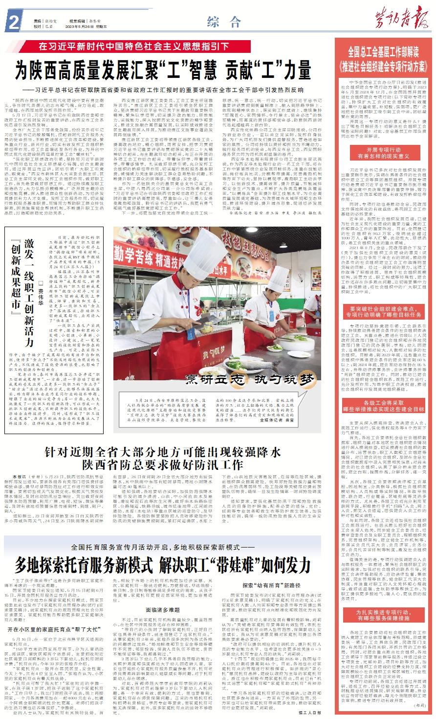 “陕西在推进中国式现代化建设中要有勇立潮头、争当时代弄潮儿的志向和气魄,奋力追赶、敢于超越,在西部地区发挥示范作用。” 5月17日,习近平总书记在听取陕西省委和省政府工作汇报时发表的重要讲话,在西安市工会系统迅速引发热烈反响。 全市广大工会干部备受鼓舞,纷纷表示将牢记习近平总书记的殷殷嘱托,扛起新时代工会服务大局的使命担当,不断推进深化工会改革和建设,聚焦重点行业、新兴行业,切实有效发挥工会组织桥梁纽带作用,将工会温暖送至各行各业,为开启中国式现代化建设陕西篇章拧紧工会“螺丝钉”。 “强化职工思想政治引领,坚持用习近平新时代中国特色社会主义思想凝心铸魂,结合主题教育,通过开展宣传宣讲,团结引领广大职工听党话、跟党走。”西安市碑林区人大常委会副主任、区总工会主席何文说,发挥工会组织作用,做好职工工作,首先是要做好思想工作。通过持续激发职工创造活力,大力弘扬劳模精神,广泛开展主题劳动和技能竞赛,深入推进群众性创新活动,为经济发展提供有力人才支撑。发挥工会服务作用,切实履行维权服务基本职责,用情用力帮助职工群众排忧解难,因类施策健全帮扶机制,不断提升职工生活品质,打造和谐稳定劳动关系。 西安曲江新区党工委委员、工会工委主任寇雅玲表示,“曲江新区工会工委将引领全区职工群众,坚决贯彻习近平总书记关于主题教育重要指示精神,聚焦以学增智,切实提升政治能力、思维能力、实践能力,深入挖掘历史文化资源的精华和要义,推进文旅融合高质量发展,以实际成效推进全区主题教育深入开展,为推动曲江文旅事业蓬勃发展再创佳绩。” 曲江新区工会工委将带领曲江新区各级工会,提高政治站位,精心组织,周密安排,把学习贯彻习近平总书记重要讲话与贯彻落实党的二十大精神结合起来,与主题教育结合起来,与正在开展的各项工会工作结合起来。带着信仰学、带着责任学、带着感情学。扎实做好思想引领,充分发挥工会组织的桥梁纽带作用,切实履行维权服务基本职责,倾情倾力关注解决职工群众急难愁盼问题,不断提升职工群众的获得感、幸福感、安全感。 作为一名驻陕央企的基层党总支书记兼工会主席,中建八局西北公司第一分公司陈希斌说:“习近平总书记在听取陕西省委和省政府工作汇报时的重要讲话高屋建瓴、厚重如山,让三秦儿女备受激励和鼓舞。聆听总书记的讲话后,我更有勇气和底气做好基层党建和工会工作。” 下一步,将更加坚定自觉地带领企业员工统一思想、统一意志、统一行动,切实把习近平总书记重要讲话贯彻到衡量标准上、融入到思路举措上、体现到精神状态上、落实到工作成效上,继续秉持“军魂匠心、家国情怀、令行禁止、使命必达”的铁军精神,用高度的责任感和使命感,助推陕西新时代追赶超越再上新台阶。 西安传化丝路公司工会主席田晓旭说,公司作为新业态企业,一直以来立足实际,发挥自身优势,为广大司机朋友们提供温馨服务,营造进港如家的氛围。公司将持续以责任和担当为不竭动力,践行服务司机的使命,与西安市总工会、西安国际港务区共同为司机筑起温暖的港湾。 西安净水处理有限责任公司工会副主席武英说,作为西安净水处理行业的一名工会干部,将在工作中紧紧围绕企业发展目标任务,注重在技能培训、岗位练兵比武、劳模帮带提高、完善激励机制等方面下功夫,坚持以赛促学,激励职工主动去学习。以创新技术、提高效率、提升质量、节能减排和安全生产为重点,不断扩大各类竞赛练兵覆盖面,“以赛练兵”全面提升职工技能水平,为企业高质量发展奠定基础,为改善城市水域环境和生态环境、推进环保建设、提升城市形象、促进经济发展贡献力量。 全媒体记者 苗莹 唐玉洁 申美 李江波 骆红燕