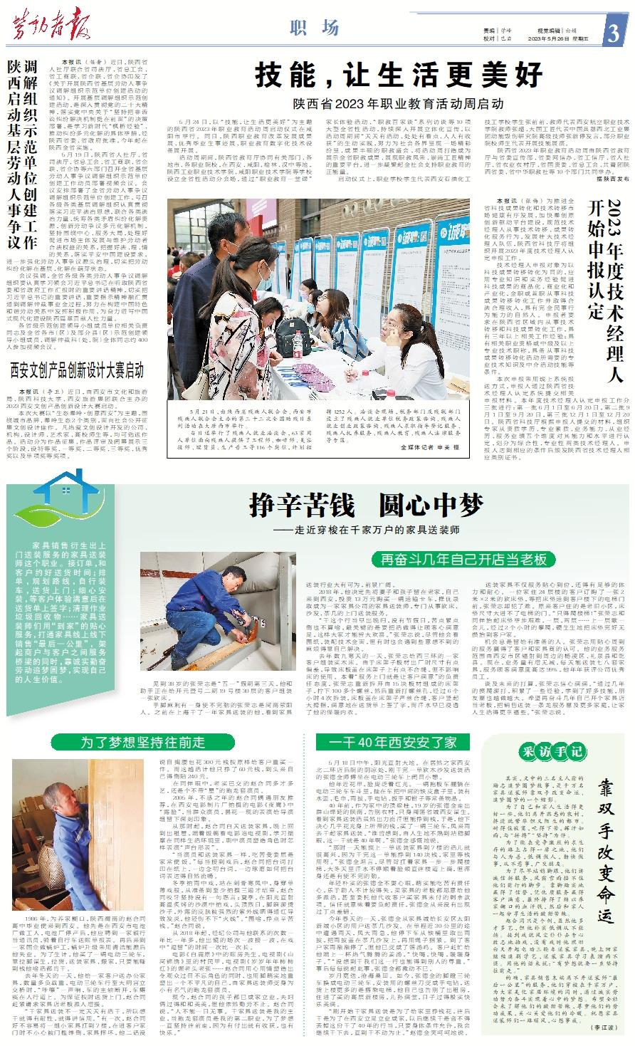 家具销售衍生出上门送装服务的家具送装师这个职业。接订单,和客户约好送货时间;排单,规划路线,自行装车,送货上门;细心安装,等客户体验满意后在送货单上签字;清理作业垃圾回收物……家具送装师们用“到家”的贴心服务,打通家具线上线下销售“最后一公里”, 架起商户与客户之间服务桥梁的同时,靠诚实勤奋劳动追梦圆梦,实现自己的人生价值。再奋斗几年自己开店当老板 见到38岁的张荣志是“五一”假期第三天,他和助手正在给开元壹号二期19号楼30层的客户组装一张软床。 手脚麻利有一身使不完劲的张荣志是河南荥阳人。之前在上海干了一年家具送装的他,看到家具送装行业大有可为,前景广阔。 2018年,他决定先将妻子和孩子留在老家,自己来到西安,投资13万元购买一辆运输卡车,择优录取成为一家家具公司的家具送装师,专门从事软床、沙发、茶几的上门送装服务。 “干这个行当早出晚归,没有节假日,苦点累点倒也不算啥,最关键的是要把活做得让顾客心满意足,这样大家才能皆大欢喜。”张荣志说,尽管他会看图纸,装配技术全面,但有时也会遇到些意想不到的麻烦得靠自己解决。 去年数九寒天的一天,张荣志给西三环的一家客户组装实木床。由于床架子板材出厂时尺寸有点偏差,导致床板盖在床架子上有点不合缝,但不影响床的使用。本着“服务上门就是让客户满意”的负责任态度,张荣志重新拆开由15块板材组成的床架子,拧下100多个螺丝,然后重新打螺丝孔,经过6个小时4次拆装,床板盖在床架子严丝合缝,客户竖起大拇指,满意地在送货单上签了字,而汗水早已浸透了他的保暖内衣。 送装家具不仅服务贴心到位,还得有足够的体力和耐心。一位家住24层楼的客户订购了一张2米×2米的软床垫,等把床垫运到客户楼下的电梯门前,张荣志却犯了难。原来客户住的是老旧小区,床垫尺寸大进不了电梯的门。“只得爬楼梯!”张荣志和同伴抬起床垫举步艰难,一层,两层……上一层歇一会儿,经过2个小时的攀爬,硬生生地把床垫完好无损抬到客户家。 机会总是留给有准备的人。张荣志用贴心周到的服务赢得了客户和家具商的认可。他的业务服务范围由西安市区辐射到周边的杨凌区、礼泉县和乾县。现在,业务量有增无减,每天能送装七八套家具,服务顾客满意度高达99%,他年年获评公司优秀员工。 谈及未来的打算,张荣志信心满满。“通过几年的摸爬滚打,积累了一些经验,学到了好多技能,朋友圈也越做越大。希望再奋斗几年自己开个家具店当老板,把销售送装一条龙服务惠及更多家庭,让家人生活得更幸福些。”张荣志说。为了梦想坚持往前走 1986年,为养家糊口,陕西渭南的赵合同高中毕业便来到西安。他先是在西安市电池厂做工人,电池厂停产后,他应聘到一家银行当通讯员,骑着自行车送账单报表。再后来到一家国企做锅炉工,锅炉升级采用清洁能源后他失业。为了生计,他买了一辆电动三轮车,靠拉脚谋生,拉货、送装家具、搬家,只要能赚到钱他啥活都肯干。 去年冬天的一天,他给一家客户送办公家具,数量多负载重,电动三轮车行至大明宫立交桥时,“咔嚓”一声响,车的主轴断开,车瘫痪在人行道上。为保证按时送货上门,赵合同赶紧请求家具店老板派人增援。 “干家具送装不一定天天有活干,所以想干就得有耐性,就得讲信用。”有一次,赵合同好不容易将一组小家具扛到7楼,在进客户家门时不小心被门槛绊倒,家具摔坏,他二话没说自掏腰包花300元钱按原样给客户重买一件。而这趟活计他只挣了60元钱,到头来自己得倒贴240元。 在同伴眼中,老实巴交的赵合同多才多艺,还是个不带“星”的跑龙套演员。 2005年,不惑之年的赵合同偶遇朋友推荐,在西安电影制片厂拍摄的电影《夜鹰》中“露脸”,当群众演员,昙花一现的表演给导演组留下深刻印象。 从那时起,赵合同白天送装家具,晚上回到出租屋,端着饭碗看电影追电视剧,学习揣摩在同样生活环境里,剧中演员塑造角色时怎样表演“声台形表”。 “当演员和送装家具一样,吃苦受委屈是家常便饭。”每当接到戏后,赵合同把台词打印在纸上,一边念叨台词,一边琢磨如何把台词表达得自然流畅。 冬季拍雨中戏,站在刺骨寒风中,身穿单薄戏服,从准备到至少拍摄三遍才结束,赵合同咬牙坚持没有一句怨言;夏季,在阳光直射高温炙烤的沙漠中拍戏,头顶烈日,脚踩滚烫沙子,外露的皮肤被强烈的紫外线晒得通红导致发炎,他轻伤不下“火线”。“图啥,挣点辛苦钱。”赵合同说。 从2018年起,经纪公司与他联系的次数一年比一年多,他出镜的场次一波接一波,在戏中“逗留”的时间一次比一次长。 电影《白鹿原》中的账房先生,电视剧《山河锦绣》里的村民甲,电视剧《岁岁年年柿柿红》的倔老头老张……赵合同用心用情塑造出令观众过目不忘角色的同时,也用脚踏实地重塑出一个不平凡的自己,由家具送装师变身为小有名气的跑龙套演员。 现今,赵合同的孩子都已成家立业,夫妇俩过得和和美美,但他依然勤劳不止。赵合同说,“人不能一日无事。干家具送装是我的主业,当跑龙套演员是我的第二职业,为了梦想一直坚持往前走,因为有付出就有收获,也有快乐。”一干40年西安安了家 5月18日中午,阳光直射大地。在居然之家西安北二环店后院的阴凉处,刚干完一单软木沙发送装活的张德全师傅坐在电动三轮车